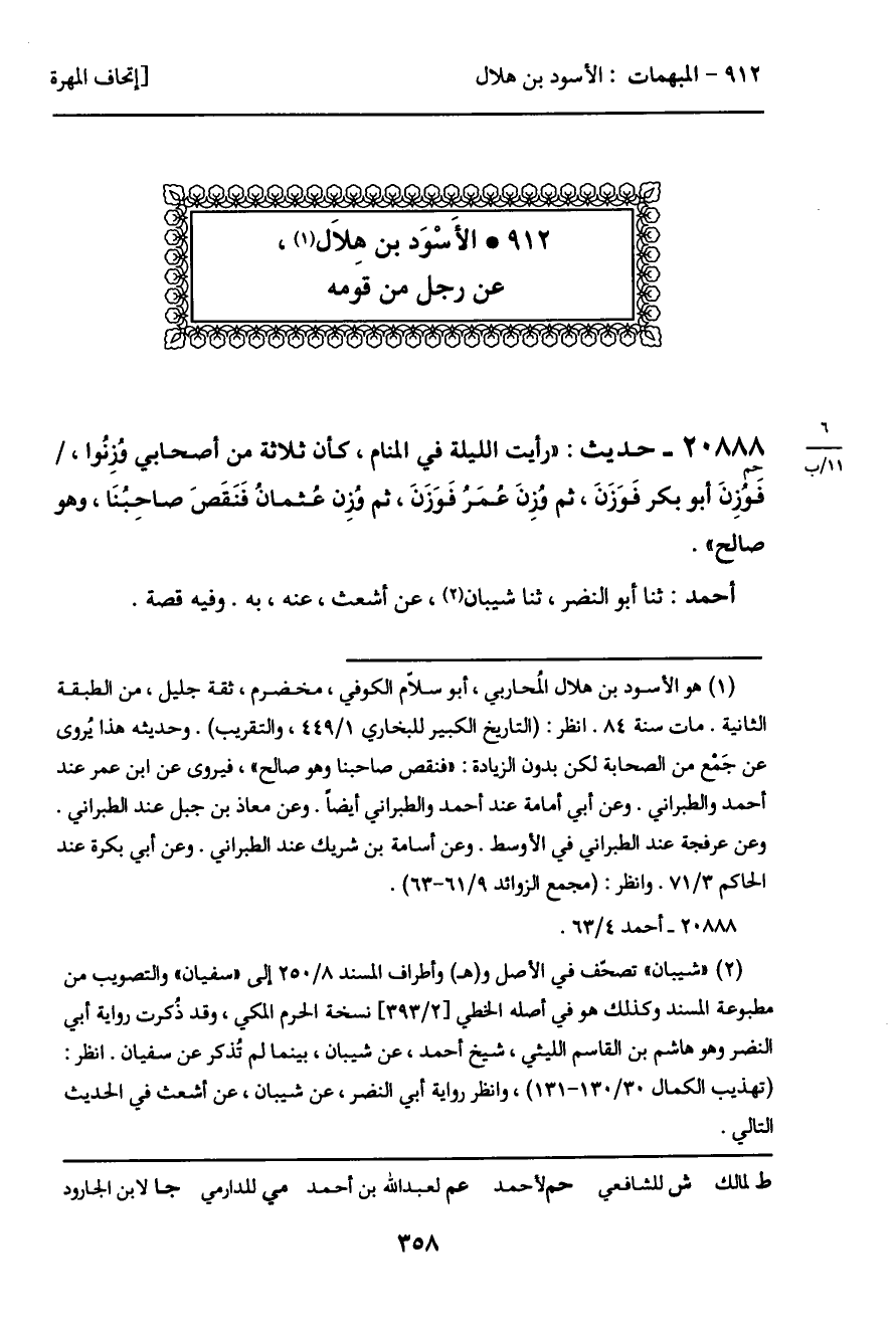 20888 - حديث (حم) : "رأيت الليلة في المنام، كأن ثلاثة من أصحابي وُزِنُوا، فَوُزنَ أبو بكر فَوَزَنَ، ثم وُزِنَ عمَرُ فَوَزَنَ، ثم وُزِن عُثمانُ فَنَقَصَ صاحِبُنَا، وهو صالح".