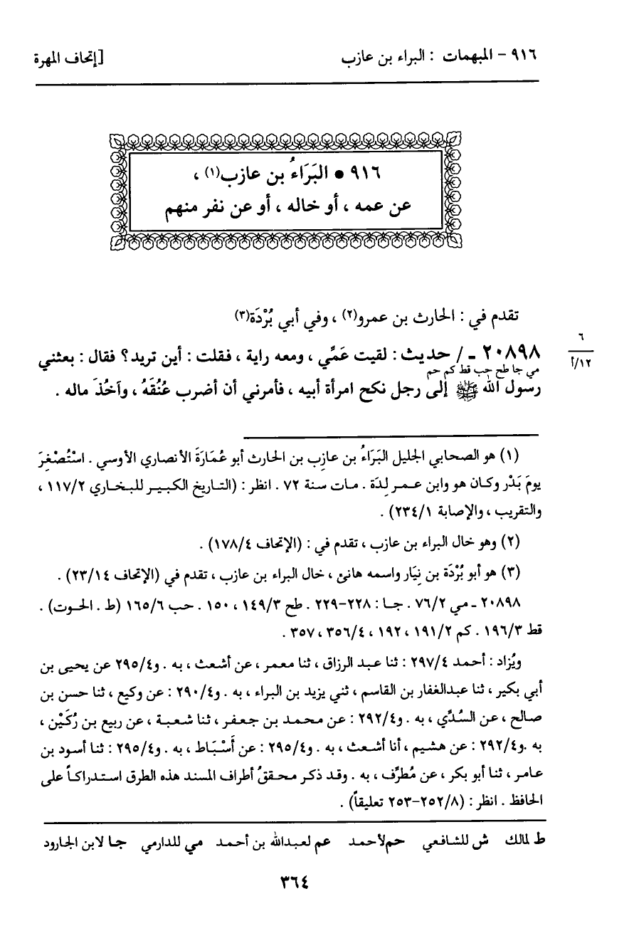طح فيه: ثنا فهد، ثنا أحمد بن يونس، ثنا أبو بكر بن عَياش، عن مطَرف، عن أبي الجَهْم، عن البراء، ولم يسم أحداً. وعن حسين بن نصر، ثنا يوسف بن عدي، ثنا عبيد الله بن عمرو، عن زيد بن أبي أُنَيْسَة، عن جابر الجعْفِي، عن يزيد بن البراء، عن أبيه قال: لقيني خالي ... فذكره.