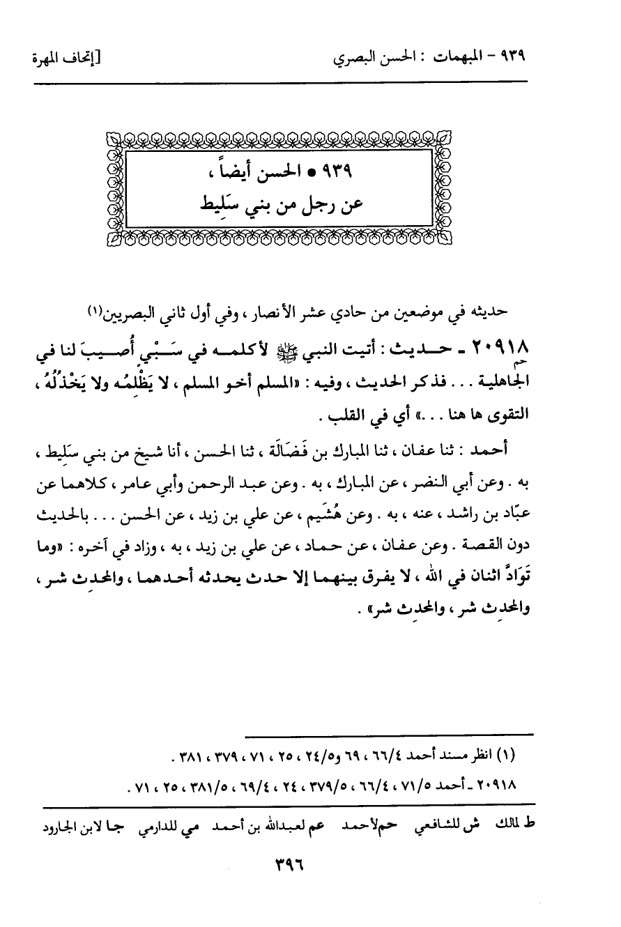أحمد: ثنا عفان، ثنا المبارك بن فَضَالَة، ثنا الحسن، أنا شيخ من بني سَلِيط، به. وعن أبي النضر، عن المبارك، به. وعن عبد الرحمن وأبي عامر، كلاهما عن عبّاد بن راشد، عنه، به. وعن هُشيم، عن علي بن زيد، عن الحسن ... بالحديث دون القصة. وعن عفان، عن حماد، عن علي بن زيد، به، وزاد في آخره: "وما تَوَاد اثنان في الله، لا يفرق بينهما إلا حدث يحدثه أحدهما، والمحدِث شر، والمحدِث شر، والمحدِث شر".