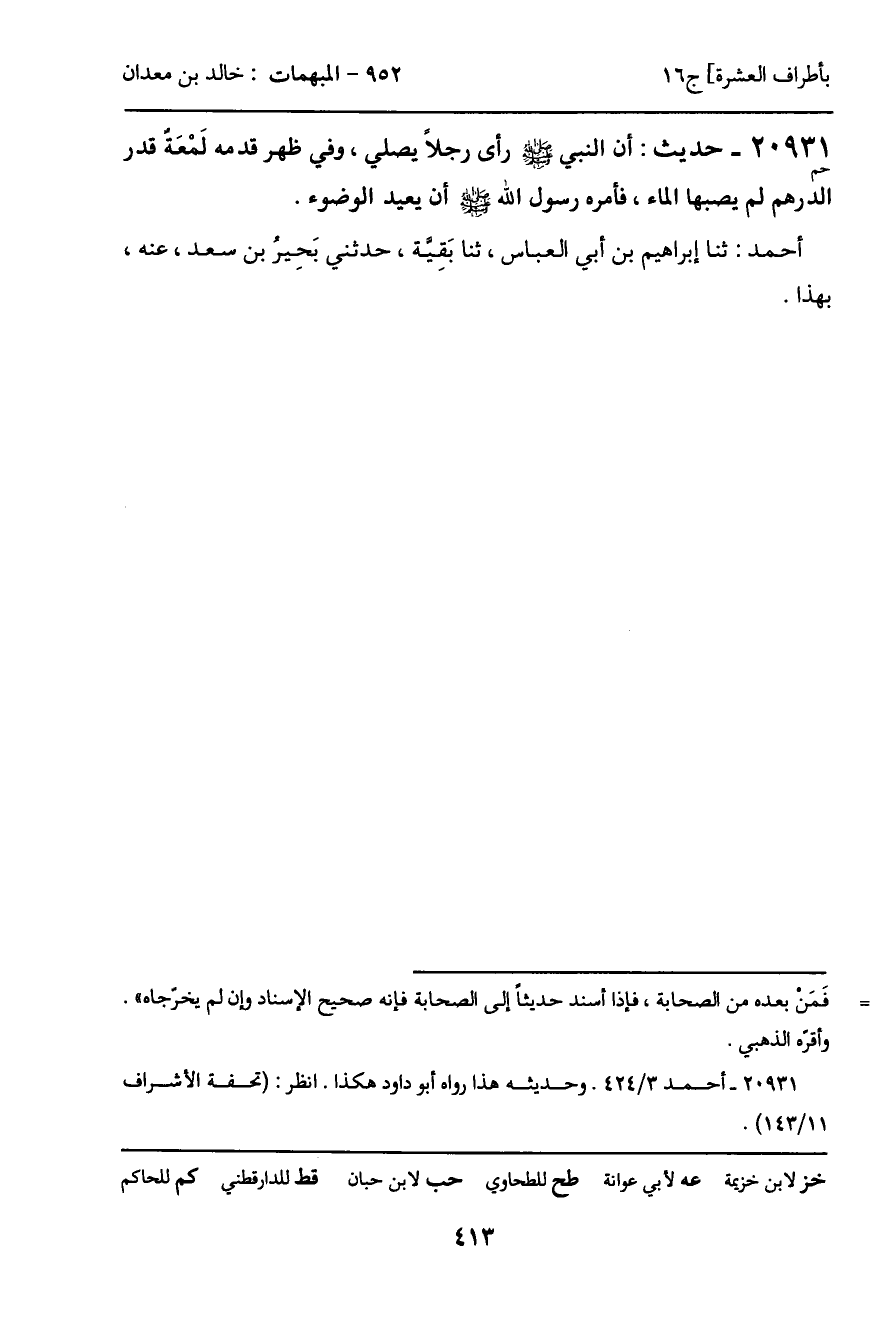 20931 - حديث (حم) : أن النبي - صَلَّى اللَّهُ عَلَيْهِ وَسَلَّمَ - رأى رجلاً يصلي، وفي ظهر قدمه لَمْعَه قدر الدرهم لم يصبها الماء، فأمره رسول الله - صَلَّى اللَّهُ عَلَيْهِ وَسَلَّمَ - أن يعيد الوضوء.