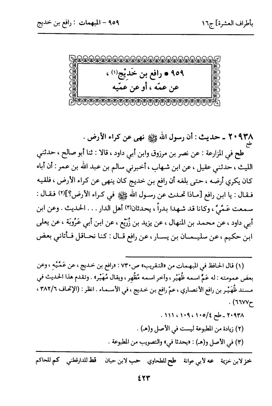 طح في المزارعة: عن نصر بن مرزوق وابن أبي داود، قالا: ثنا أبو صالح، حدثني الليث، حدثنى عقيل، عن ابن شهاب، أخبرني سالم بن عبد الله بن عمر: أن أباه كان يكري أرضه، حتى بلغه أن رافع بن خديج كان ينهى عن كراء الأرض، فلقيه فقال: يا ابن رافع [ماذا تحدث عن رسول الله - صَلَّى اللَّهُ عَلَيْهِ وَسَلَّمَ - في كراء الأرض؟] فقال: سمعت عَمى، وكانا قد شهدا بدراً، يحدثان أهل الدار ... الحديث. وعن ابن أبي داود، عن محمد بن المنهال، عن يزيد بن زُريع، عن ابن أبي عَرُوبَة، عن يعلى ابن حكيم، عن سليمان بن يسار، عن رافع قال: كنا نحاقل فأتاني بعض