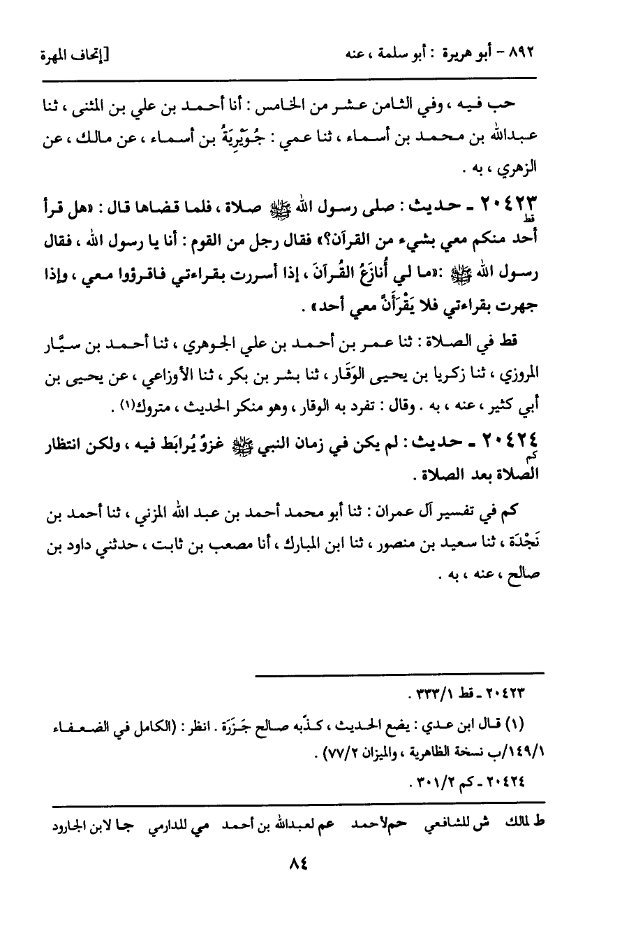 قط في الصلاة: ثنا عمر بن أحمد بن علي الجوهري، ثنا أحمد بن سيار المروزي، ثنا زكريا بن يحيى الوقَار، ثنا بشر بن بكر، ثنا الأوزاعي، عن يحيى بن أبي كثير، عنه، به. وقال: تفرد به الوقار، وهو مبهر الحديث، متروك.
