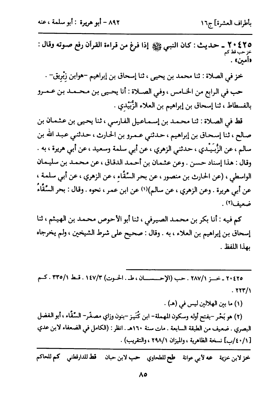 قط في الصلاة: ثنا محمد بن إسماعيل الفارسي، ثنا يحيى بن عثمان بن صالح، ثنا إسحاق بن إبراهيم، حدثني عمرو بن الحارث، حدثني عبد الله بن سالم، عن الزبَيْدي، حدثني الزهري، عن أبي سلمة وسعيد، عن أبي هريرة، به.