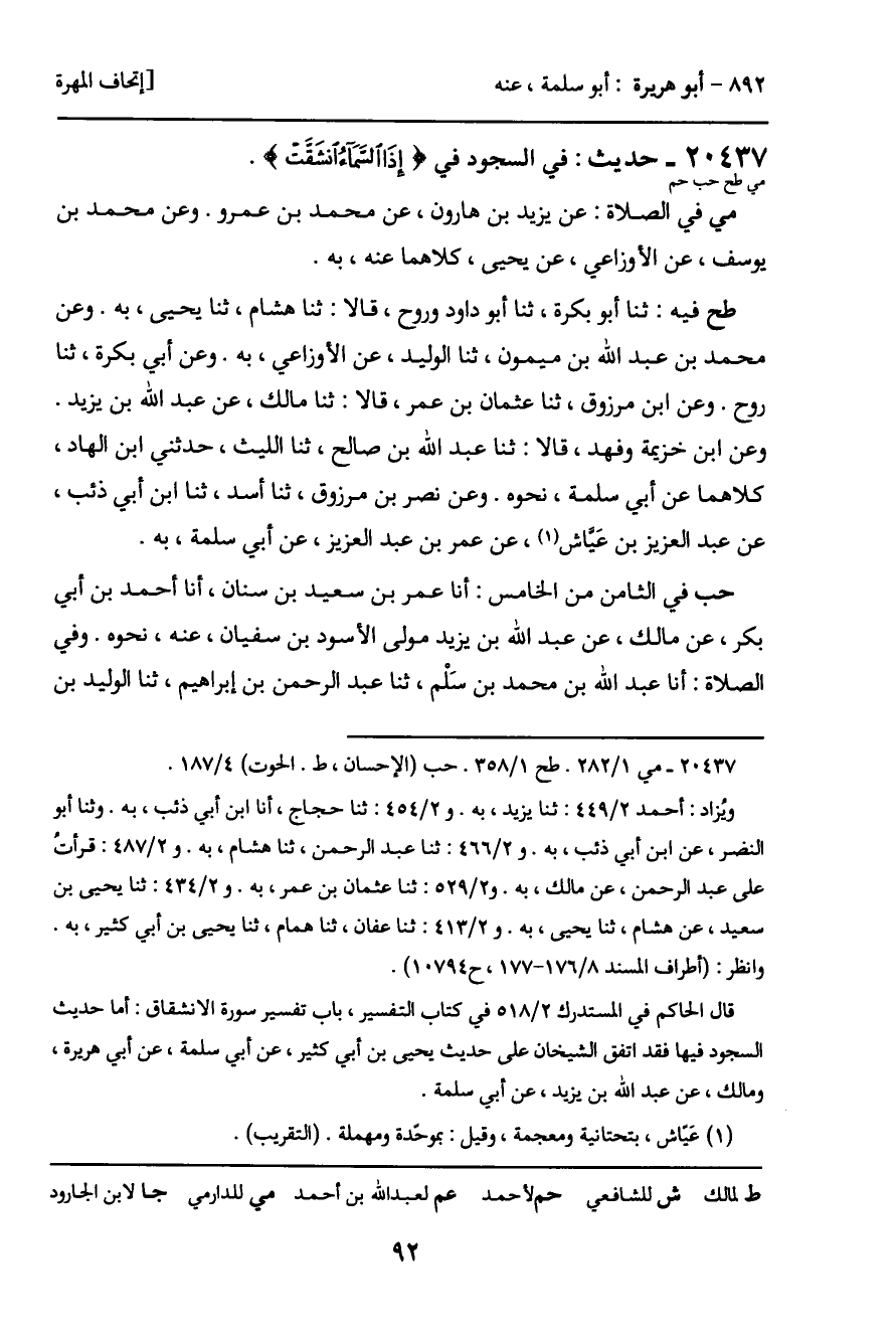 20437 - حديث (مي طح حب حم) : في السجود في (إِذَا السَّمَاءُ انْشَقَّتْ) .