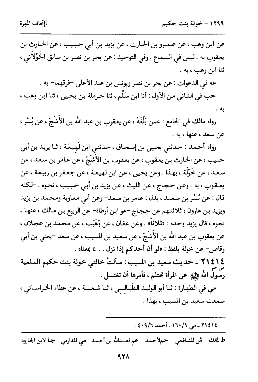 21414 - حديث سعيد بن المسيب (مي حم) : سألتْ خالتي خولة بنت حكيم السلمية رسول الله - صَلَّى اللَّهُ عَلَيْهِ وَسَلَّمَ - عن المرأة تحتلم، فأمرها أن تغتسل.