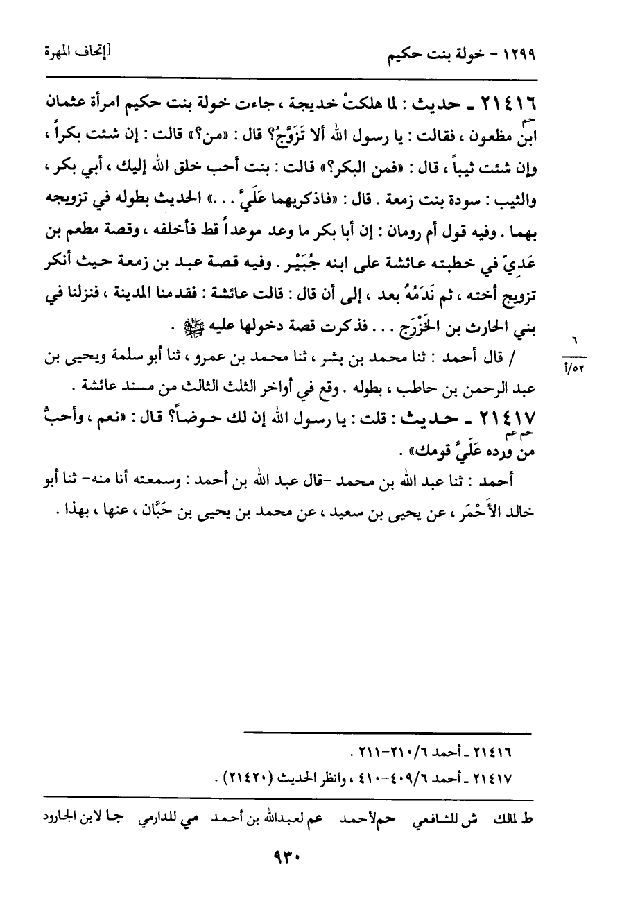 21416 - حديث (حم) : لما هلكتْ خديجة، جاءت خولة بنت حكيم امرأة عثمان ابن مظعون، فقالت: يا رسول الله ألا تَزَوجُ؟ قال: "من؟ " قالت: إن شئت بكرا، وإن شئت ثيباً، قال: "فمن البكر؟ " قالت: بنت أحب خلق الله إليك، أبي بكر، والثيب: سودة بنت زمعة. قال: "فاذكريهما عَلَيَّ ... " الحديث بطوله في تزويجه بهما. وفيه قول أم رومان: إن أبا بكر ما وعد موعداً قط فأخلفه، وقصة مطعم بن عَدِي في خطبته عائشة على ابنه جبَيْر. وفيه قصة عبد بن زمعة حيث أنكر تزويج أخته، ثم نَدَمهُ بعد، إلى أن قال: قالت عائشة: فقدمنا المدينة، فنزلنا في بني الحارث بن الخَزْرَج ... فذكرت قصة دخولها عليه - صَلَّى اللَّهُ عَلَيْهِ وَسَلَّمَ -.
