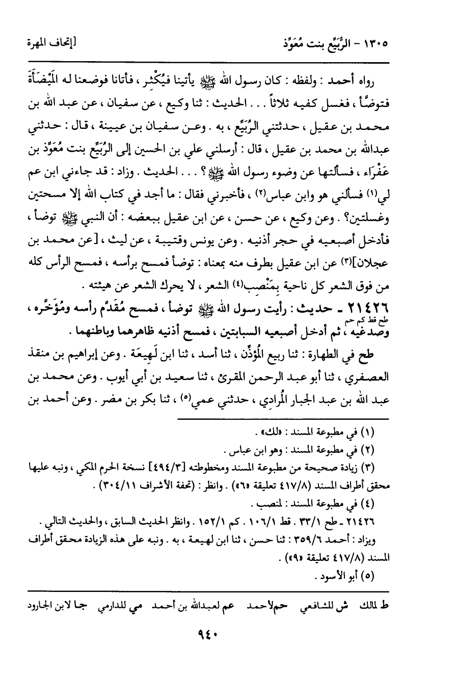 21426 - حديث (طح قط كم حم) : رأيت رسول الله - صَلَّى اللَّهُ عَلَيْهِ وَسَلَّمَ - توضأ، فمسح مُقَدم رأسه ومؤَخره، وصدغيه، ثم أدخل أصبعيه السبابتين، فمسح أذنيه ظاهرهما وباطنهما.