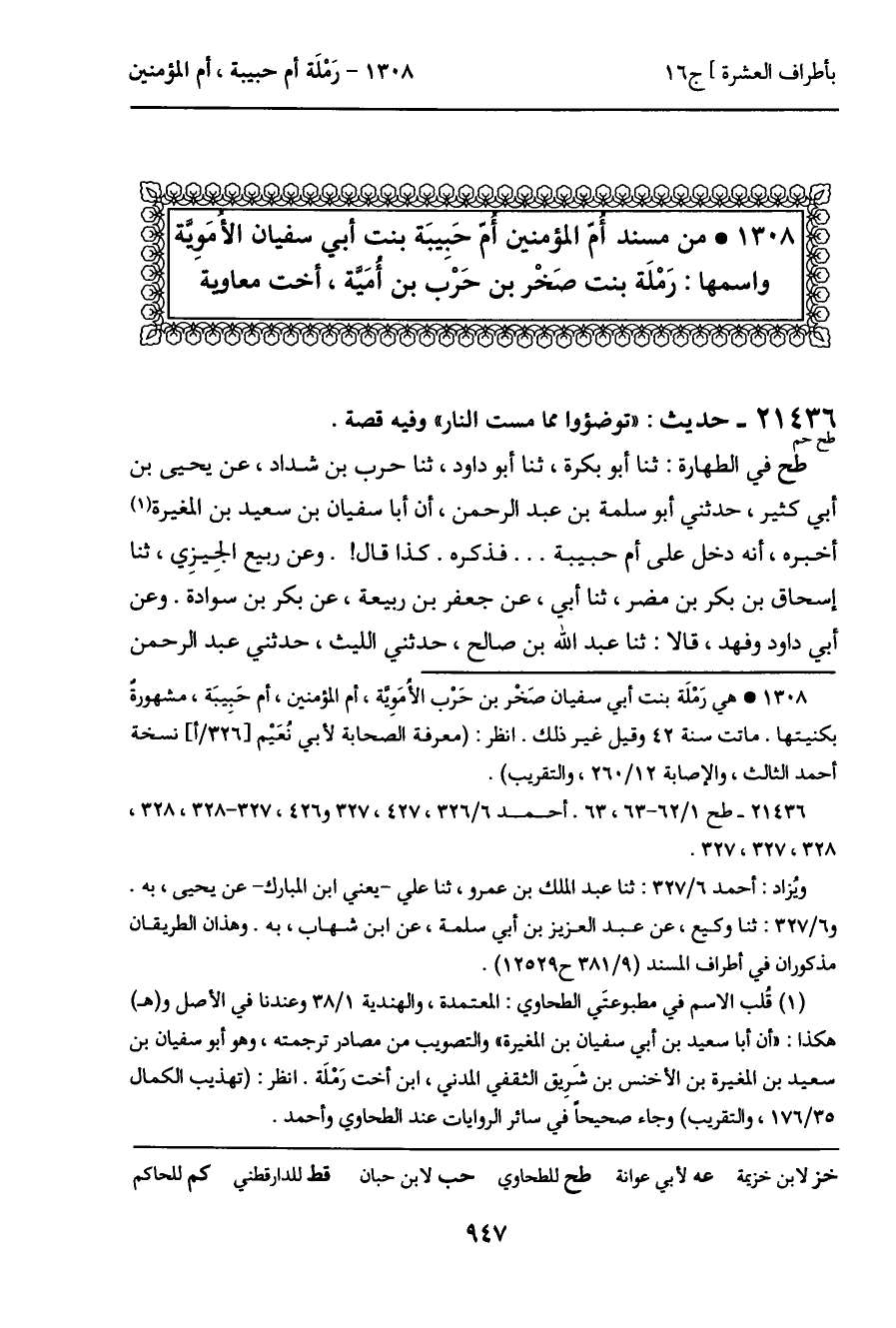 1308 ـ من مسند أم المؤمنين أم حبيبة بنت أبي سفيان الأموية واسمها: رملة بنت صخر بن حرب بن أمية، أخت معاوية