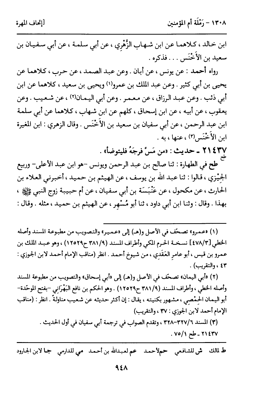 21437 - حديث (طح) : "من مس فرجَهُ فليتوضأ".