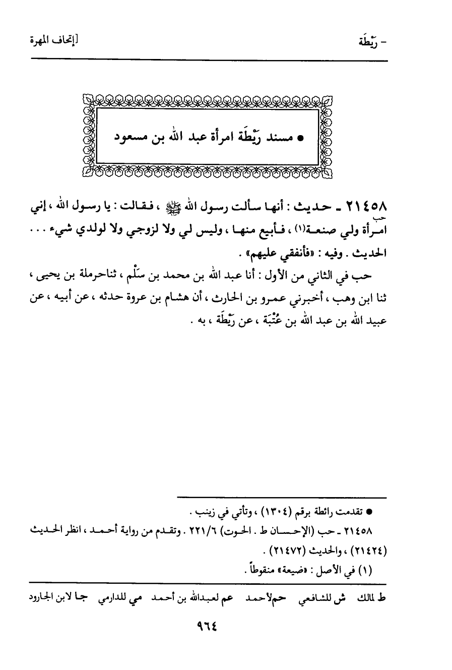 حب في الثاني من الأول: أنا عبد الله بن محمد بن سَلْم، ثنا حرملة بن يحيى، ثنا ابن وهب، أخبرني عمرو بن الحارث، أن هشام بن عروة حدثه، عن أبيه، عن عبيد الله بن عبد الله بن عُتْبَة، عن ريطَة، به.