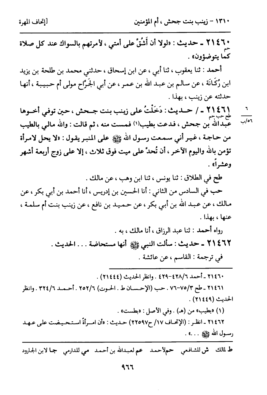 21461 - حديث (طح حب حم) : دَخَلْتُ على زينب بنت جحش، حين توفي أخوها عبد الله بن جحش، فدعت بطيب فمست منه، ثم قالت: والله مالي بالطيب من حاجة، غير أني سمعت رسول الله - صَلَّى اللَّهُ عَلَيْهِ وَسَلَّمَ - على المنبر يقول: "لا يحل لامرأة تؤمن بالله واليوم الآخر، أن تُحدّ على ميت فوق ثلاث، إلا على زوج أربعة أشهر وعشراً".