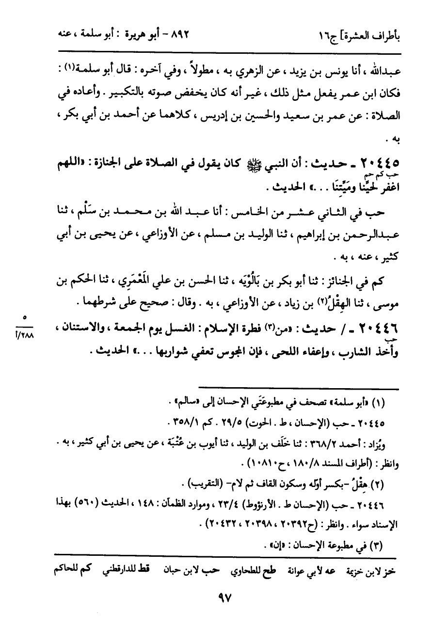 20445 - حديث (حب كم حم) : أن النبي - صَلَّى اللَّهُ عَلَيْهِ وَسَلَّمَ - كان يقول في الصلاة على الجنازة: "اللهم اغفر لحينا ومَيتنَا ... " الحديث.
