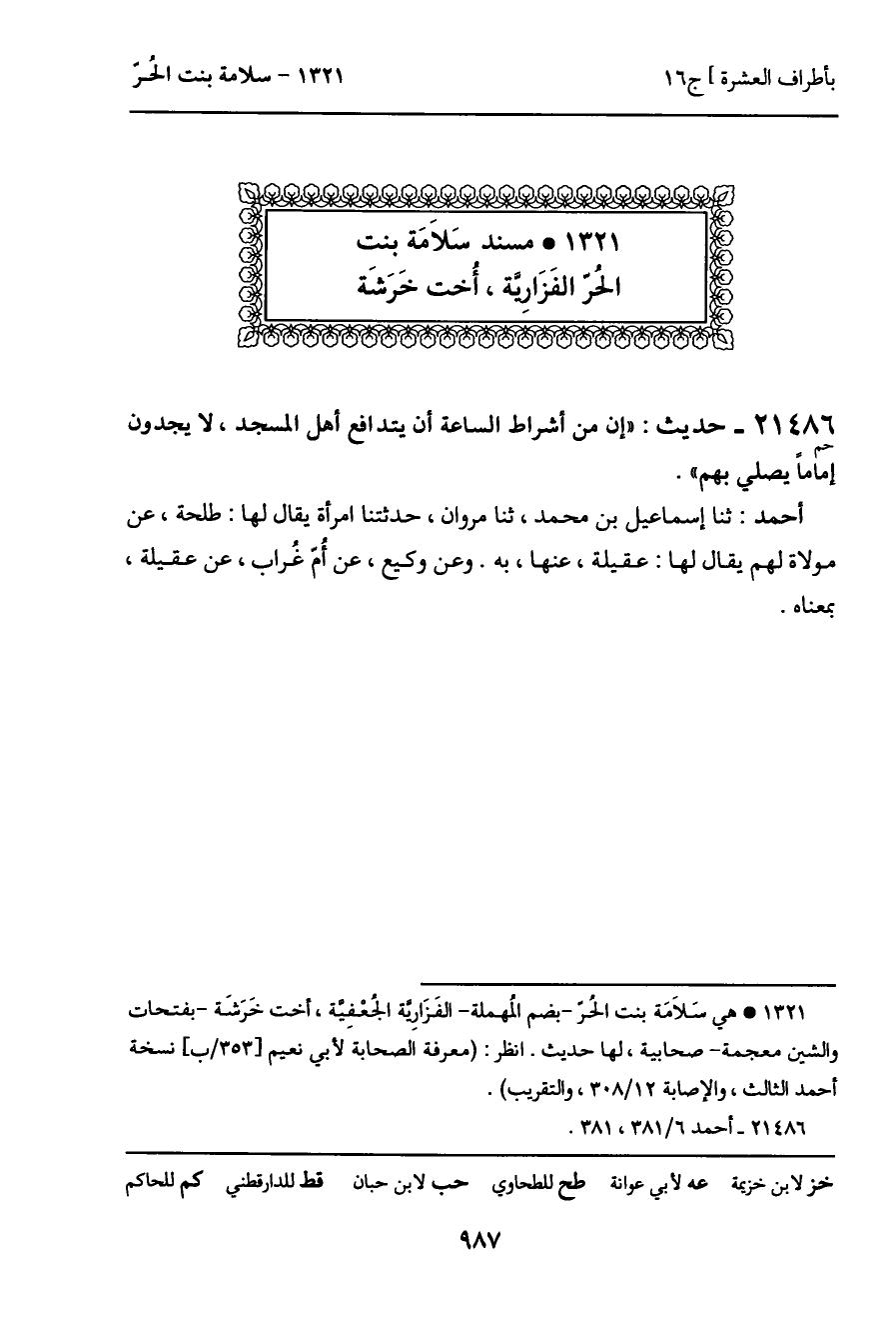 1321 ـ مسند سلامة بنت الحر الفزارية، أخت خرشة
