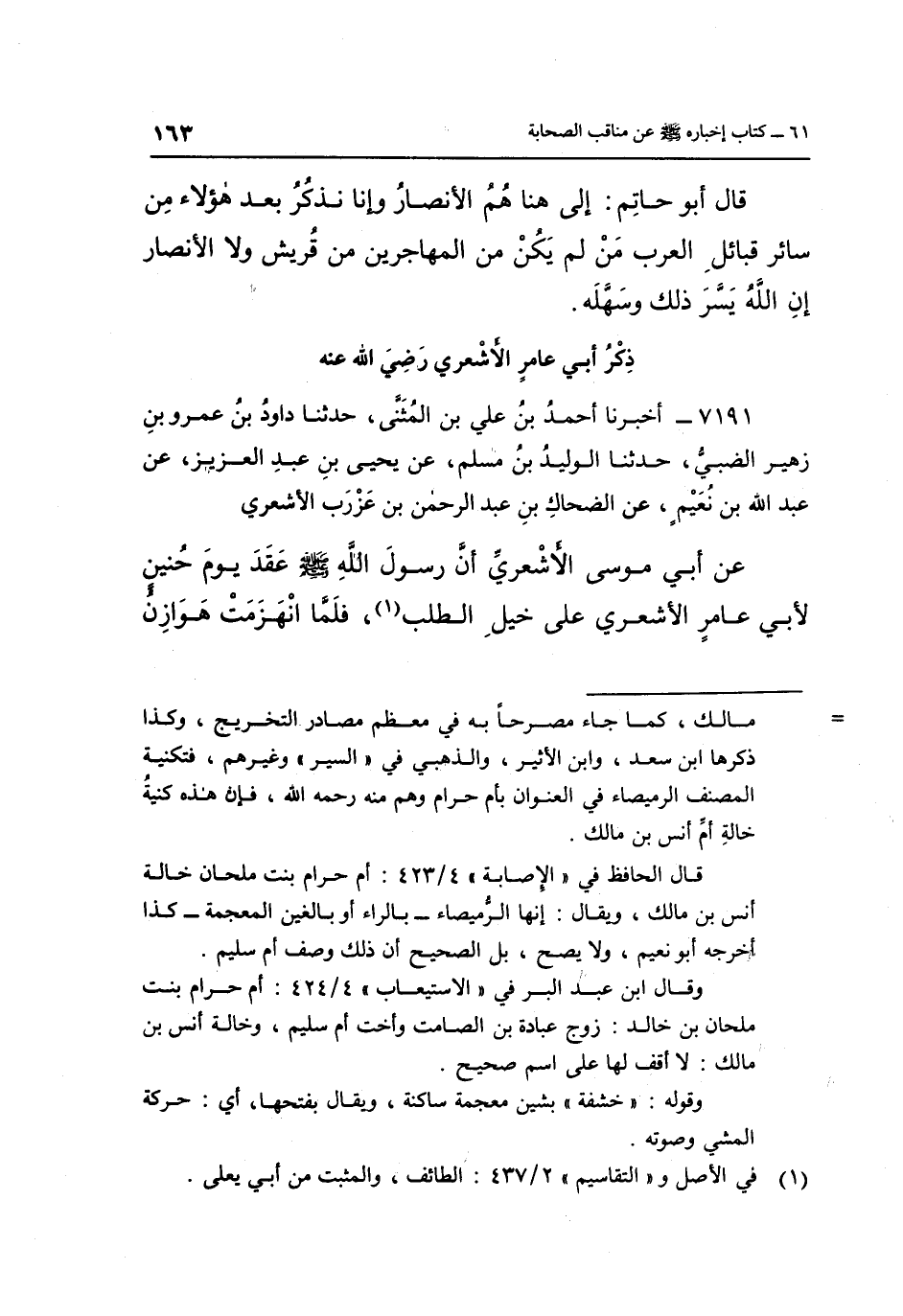 7191- أَخْبَرَنَا أَحْمَدُ بْنُ عَلِيِّ بْنِ الْمُثَنَّى حَدَّثَنَا دَاوُدُ بْنُ عَمْرِو بْنِ زُهَيْرٍ الضَّبِّيُّ حَدَّثَنَا الْوَلِيدُ بْنُ مُسْلِمٍ عَنْ يَحْيَى بْنِ عَبْدِ الْعَزِيزِ عَنْ عَبْدِ اللَّهِ بْنِ نُعَيْمٍ عَنِ الضَّحَّاكِ بْنِ عَبْدِ الرَّحْمَنِ بْنِ عَزْرَبِ الْأَشْعَرِيِّ عَنْ أَبِي مُوسَى الْأَشْعَرِيِّ: أَنَّ رَسُولَ اللَّهِ صَلَّى اللَّهُ عَلَيْهِ وَسَلَّمَ عَقَدَ يَوْمَ حُنَيْنٍ لِأَبِي عَامِرٍ الْأَشْعَرِيِّ عَلَى خَيْلِ الطَّلَبِ1، فَلَمَّا انهزمت هوازن