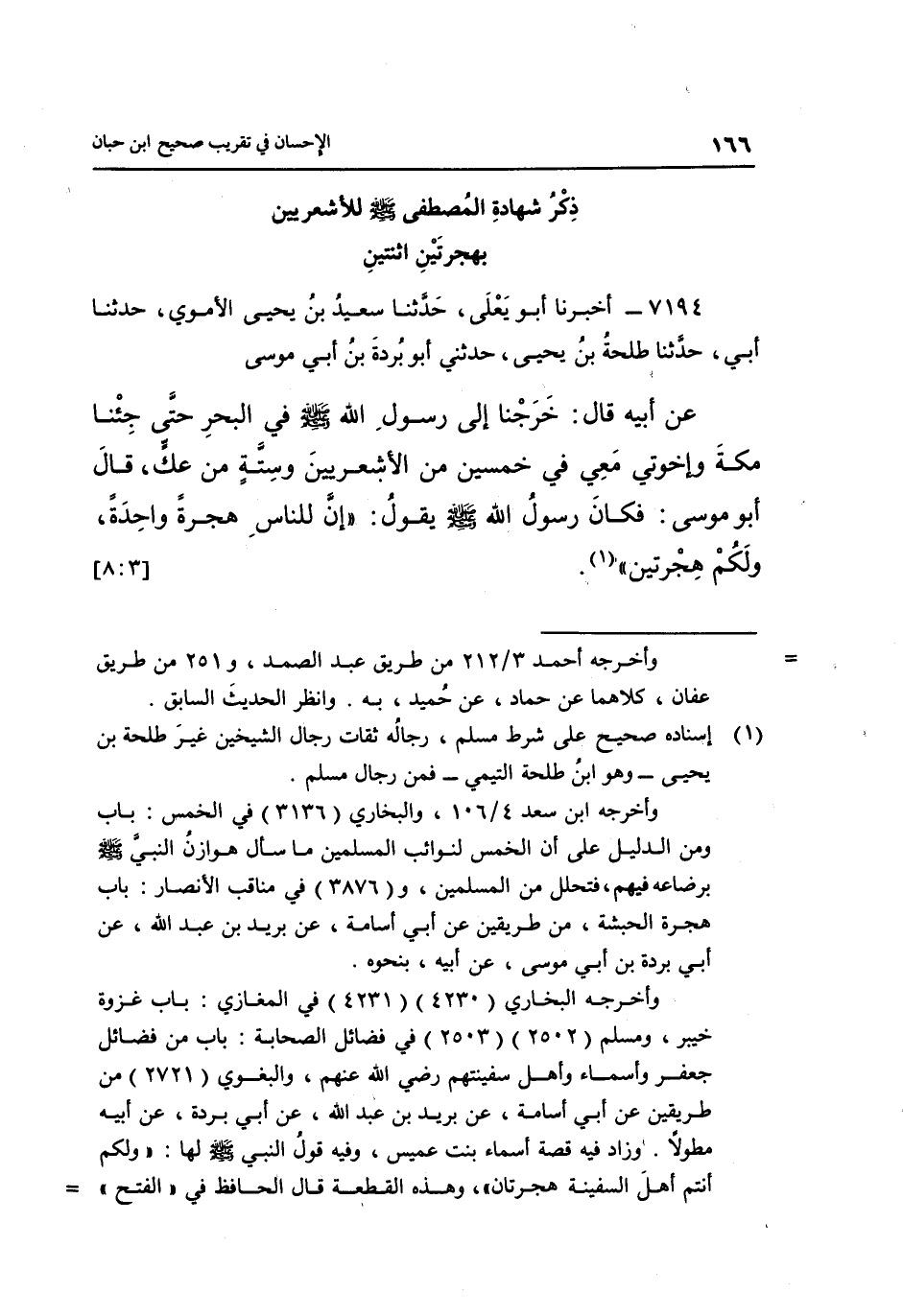 7194- أَخْبَرَنَا أَبُو يَعْلَى حَدَّثَنَا سَعِيدُ بْنُ يَحْيَى الْأُمَوِيُّ حَدَّثَنَا أَبِي حَدَّثَنَا طَلْحَةُ بْنُ يَحْيَى حَدَّثَنِي أَبُو بُرْدَةَ بْنِ أَبِي مُوسَى عَنْ أَبِيهِ قَالَ: خَرَجْنَا إِلَى رَسُولِ اللَّهِ صَلَّى اللَّهُ عَلَيْهِ وَسَلَّمَ في الْبَحْرِ حَتَّى جِئْنَا مَكَّةَ وَإِخْوَتِي مَعِي فِي خَمْسِينَ مِنَ الْأَشْعَرِيِّينَ وَسِتَّةٍ مِنْ عَكٍّ قَالَ أَبُو مُوسَى: فَكَانَ رَسُولُ اللَّهِ صَلَّى اللَّهُ عَلَيْهِ وَسَلَّمَ يَقُولُ: "إِنَّ لِلنَّاسِ هِجْرَةً وَاحِدَةً ولكم هجرتين" 1. [3: 8]
