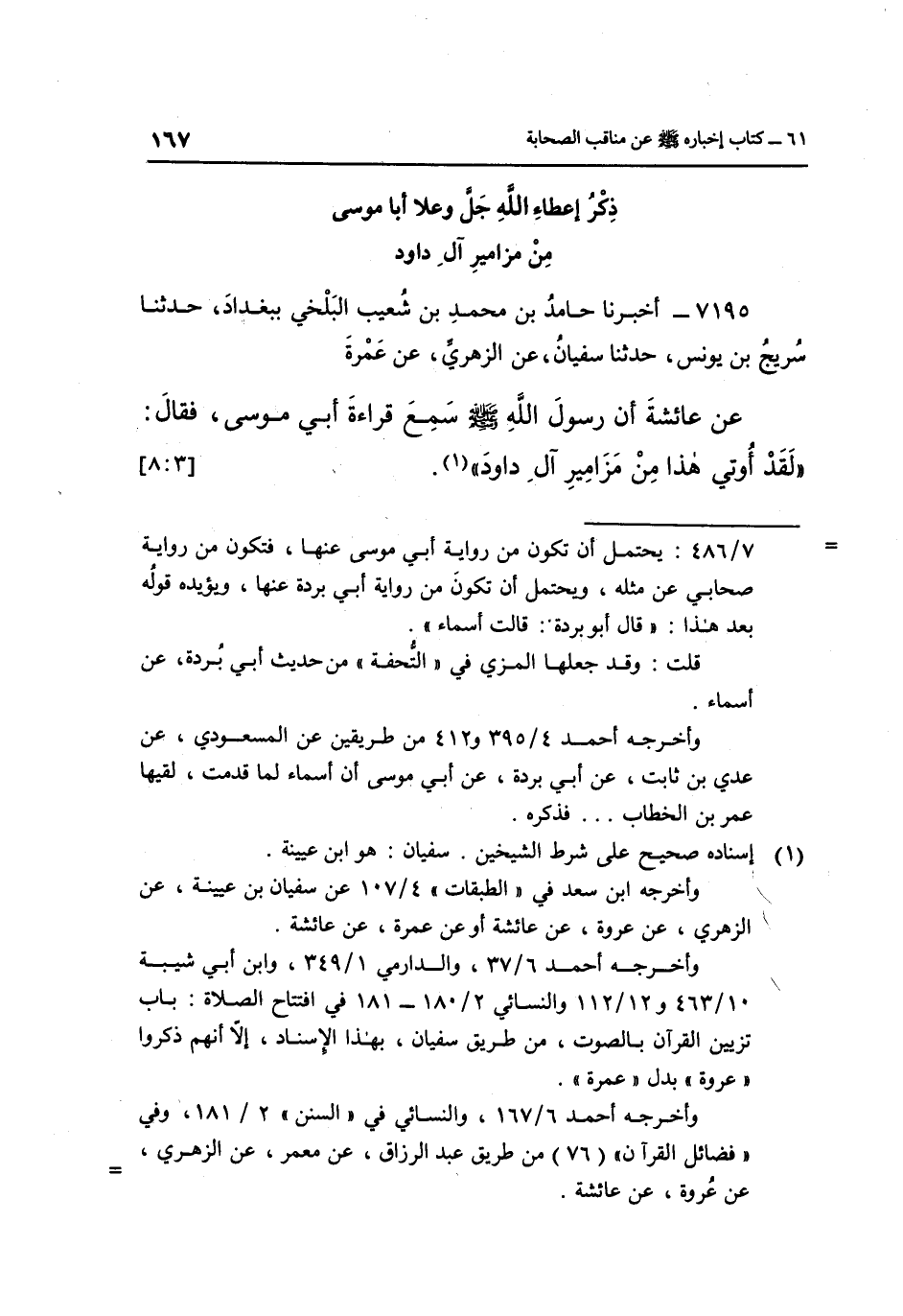 7195- أَخْبَرَنَا حَامِدُ بْنُ مُحَمَّدِ بْنِ شُعَيْبٍ الْبَلْخِيُّ بِبَغْدَادَ حَدَّثَنَا سُرَيْجُ بْنُ يُونُسَ حَدَّثَنَا سُفْيَانُ عَنِ الزُّهْرِيِّ عَنْ عَمْرَةَ عَنْ عَائِشَةَ أَنَّ رَسُولَ اللَّهِ صَلَّى اللَّهُ عَلَيْهِ وَسَلَّمَ سَمِعَ قِرَاءَةَ أَبِي مُوسَى فَقَالَ: "لَقَدْ أُوتِيَ هَذَا مِنْ مَزَامِيرِ آلِ داود" 1. [3: 8]