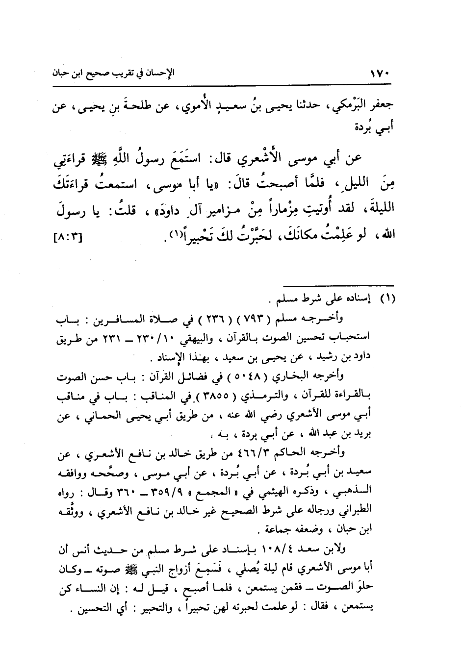 جَعْفَرٍ الْبَرْمَكِيُّ حَدَّثَنَا يَحْيَى بْنُ سَعِيدٍ الْأُمَوِيُّ عَنْ طَلْحَةَ بْنِ يَحْيَى عَنْ أَبِي بُرْدَةَ عَنْ أَبِي مُوسَى الْأَشْعَرِيِّ قَالَ: اسْتَمَعَ رَسُولُ اللَّهِ صَلَّى اللَّهُ عَلَيْهِ وَسَلَّمَ قِرَاءَتِي مِنَ اللَّيْلِ فَلَمَّا أَصْبَحْتُ قَالَ: "يَا أَبَا مُوسَى اسْتَمَعْتُ قِرَاءَتَكَ اللَّيْلَةَ لَقَدْ أُوتِيتَ مِزْمَارًا مِنْ مَزَامِيرِ آلِ دَاوُدَ"، قُلْتُ: يَا رَسُولَ اللَّهِ لو علمت مكانك لحبرت لك تحبيرا1. [3: 8]