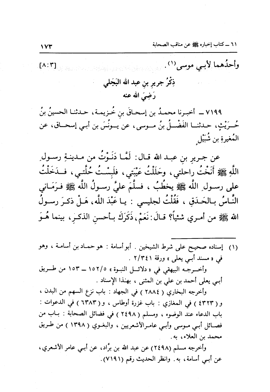 7199- أَخْبَرَنَا مُحَمَّدُ بْنُ إِسْحَاقَ بْنِ خُزَيْمَةَ حَدَّثَنَا الْحُسَيْنُ بْنُ حُرَيْثٍ حَدَّثَنَا الْفَضْلُ بْنُ مُوسَى عَنْ يُونُسَ بْنِ أَبِي إِسْحَاقَ عَنِ الْمُغِيرَةِ بْنِ شُبَيْلٍ عَنْ جَرِيرِ بْنِ عَبْدِ اللَّهِ قَالَ: لَمَّا دَنَوْتُ مِنْ مَدِينَةِ رَسُولِ اللَّهِ صَلَّى اللَّهُ عَلَيْهِ وَسَلَّمَ أَنَخْتُ رَاحِلَتِي وَحَلَلْتُ عَيْبَتِي فَلَبِسْتُ حُلَّتِي فَدَخَلْتُ عَلَى رَسُولِ اللَّهِ صَلَّى اللَّهُ عَلَيْهِ وَسَلَّمَ يَخْطُبُ فَسَلَّمَ عَلَى رَسُولِ اللَّهِ صَلَّى اللَّهُ عَلَيْهِ وَسَلَّمَ فَرَمَانِي النَّاسُ بِالْحَدَقِ فَقُلْتُ لِجَلِيسِي: يَا عَبْدَ اللَّهِ هَلْ ذَكَرَ رَسُولُ اللَّهِ صَلَّى اللَّهُ عَلَيْهِ وَسَلَّمَ مِنْ أَمْرِي شَيْئًا؟ قَالَ: نَعَمْ ذَكَرَكَ بِأَحْسَنِ الذِّكْرِ بَيْنَمَا هُوَ