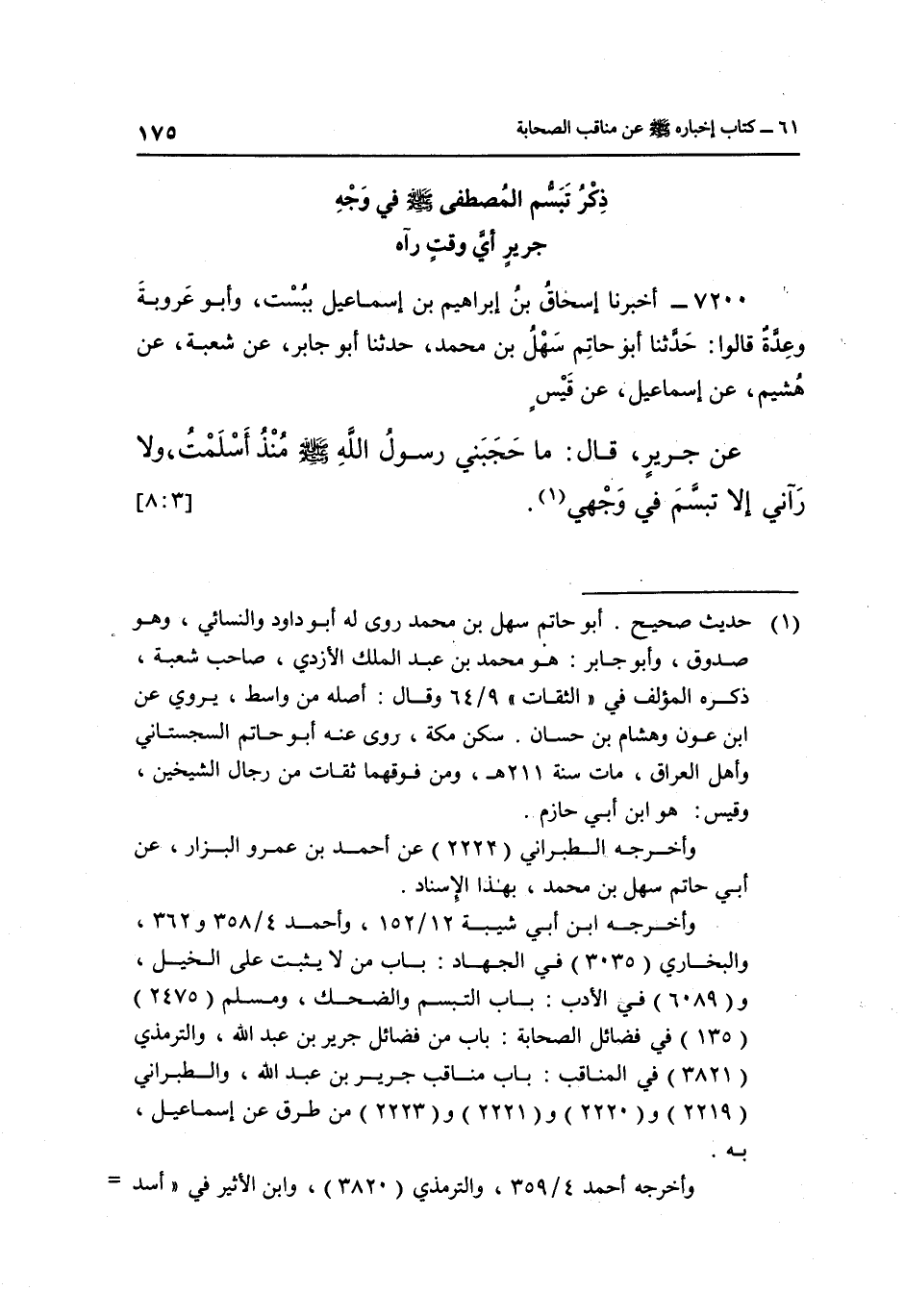 7200- أَخْبَرَنَا إِسْحَاقُ بْنُ إِبْرَاهِيمَ بْنِ إِسْمَاعِيلَ بِبُسْتَ وَأَبُو عَرُوبَةَ وَعِدَّةٌ قَالُوا حَدَّثَنَا أَبُو حَاتِمٍ سَهْلُ بْنُ مُحَمَّدٍ حَدَّثَنَا أَبُو جَابِرٍ عَنْ شُعْبَةَ عَنْ هُشَيْمٍ عَنْ إِسْمَاعِيلَ عَنْ قَيْسٍ عَنْ جَرِيرٍ قَالَ: مَا حَجَبَنِي رَسُولُ اللَّهِ صَلَّى اللَّهُ عَلَيْهِ وَسَلَّمَ مُنْذُ أَسْلَمْتُ وَلَا رَآنِي إلا تبسم في وجهي1. [3: 8]
