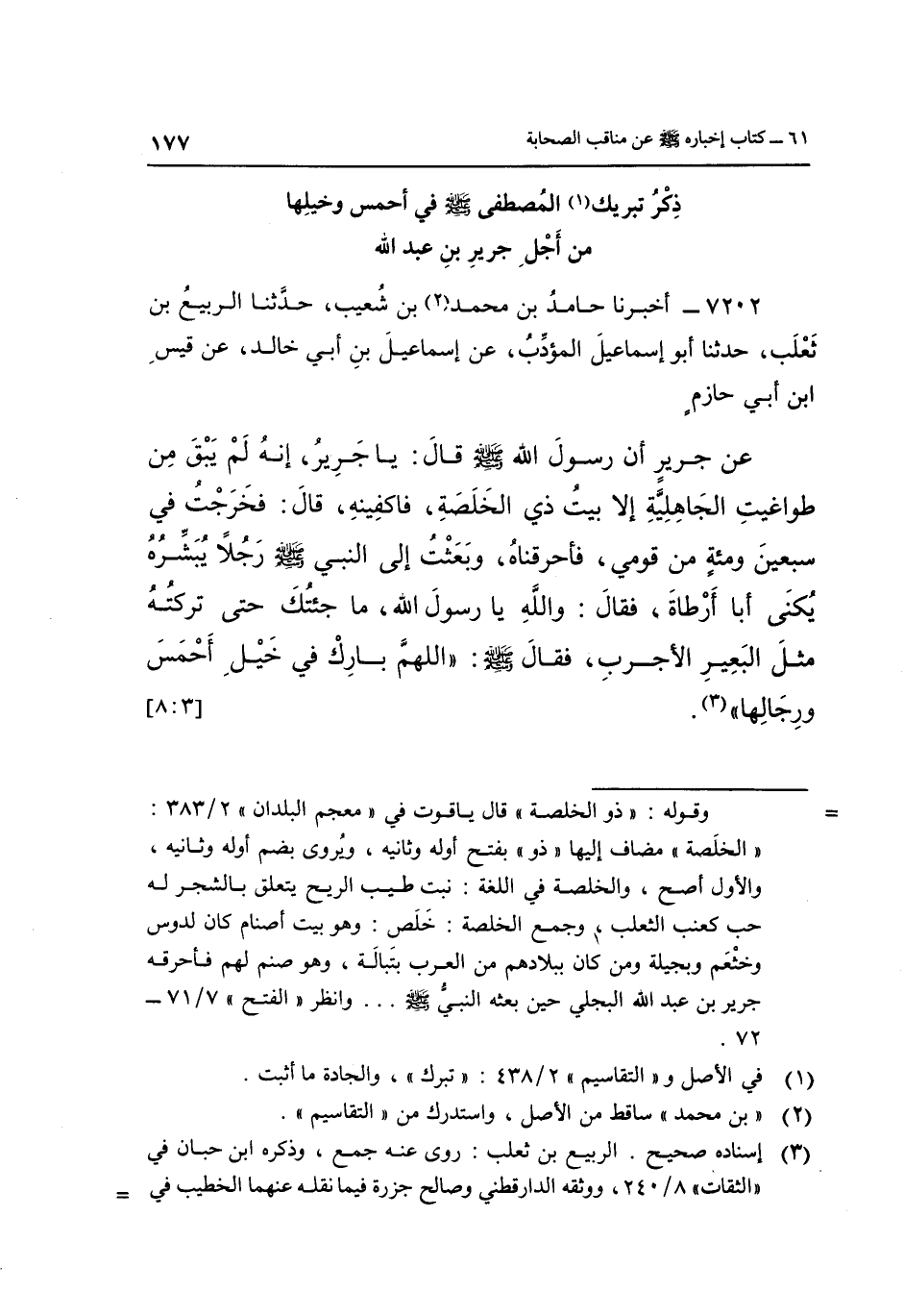 7202- أَخْبَرَنَا حَامِدُ بْنُ مُحَمَّدِ2 بْنِ شُعَيْبٍ حَدَّثَنَا الرَّبِيعُ بْنُ ثَعْلَبٍ حَدَّثَنَا أَبُو إِسْمَاعِيلَ الْمُؤَدِّبُ عَنْ إِسْمَاعِيلَ بْنِ أَبِي خَالِدٍ عَنْ قَيْسِ بْنِ أبي حازم عن جَرِيرٍ أَنَّ رَسُولَ اللَّهِ صَلَّى اللَّهُ عَلَيْهِ وسلم قَالَ: "يَا جَرِيرُ إِنَّهُ لَمْ يَبْقَ مِنْ طَوَاغِيتِ الْجَاهِلِيَّةِ إِلَّا بَيْتُ ذِي الْخَلَصَةِ فَاكْفِينِهِ", قال: فخرجت في سبعين ومئة مِنْ قَوْمِي فَأَحْرَقْنَاهُ وَبَعَثْتُ إِلَى النَّبِيِّ صَلَّى اللَّهُ عَلَيْهِ وَسَلَّمَ رَجُلًا يُبَشِّرُهُ يُكَنَّى أَبَا أَرْطَاةَ, فَقَالَ: وَاللَّهِ يَا رَسُولَ اللَّهِ مَا جِئْتُكَ حَتَّى تَرَكْتُهُ مِثْلَ الْبَعِيرِ الْأَجْرَبِ فَقَالَ صَلَّى اللَّهُ عَلَيْهِ وَسَلَّمَ: "اللَّهُمَّ بَارِكْ فِي خيل أحمس ورجالها" 3. [3: 8]