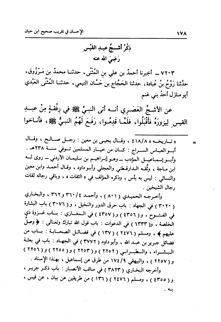 7203- أَخْبَرَنَا أَحْمَدُ بْنُ عَلِيِّ بْنِ الْمُثَنَّى حَدَّثَنَا مُحَمَّدُ بْنُ مَرْزُوقٍ حَدَّثَنَا رَوْحُ بْنُ عُبَادَةَ حدثنا حجاج بْنُ حَسَّانَ التَّيْمِيُّ حَدَّثَنَا الْمُثَنَّى الْعَبْدِيُّ أَبُو مُنَازِلٍ أَحَدُ بَنِي غَنْمٍ عَنِ الْأَشَجِّ الْعَصَرِيِّ أَنَّهُ أَتَى النَّبِيَّ صَلَّى اللَّهُ عَلَيْهِ وَسَلَّمَ فِي رُفْقَةٍ مِنْ عَبْدِ الْقَيْسِ لِيَزُورَهُ فَأَقْبَلُوا فَلَمَّا قَدِمُوا رَفَعَ لَهُمُ النَّبِيُّ صَلَّى اللَّهُ عَلَيْهِ وَسَلَّمَ فَأَنَاخُوا
