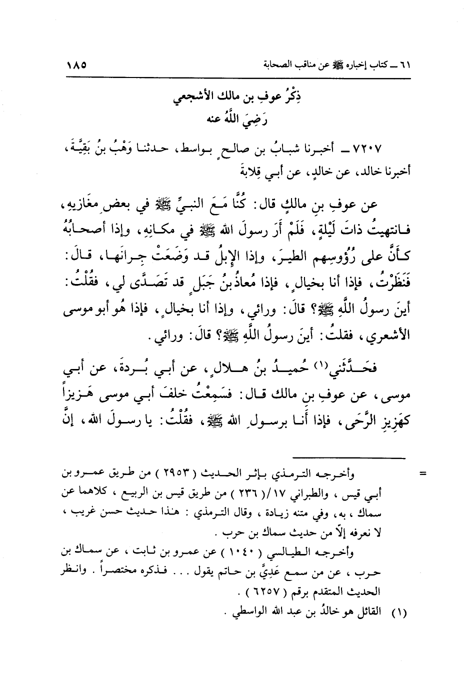 7207- أَخْبَرَنَا شَبَابُ بْنُ صَالِحٍ بِوَاسِطَ حَدَّثَنَا وَهْبُ بْنُ بَقِيَّةَ أَخْبَرَنَا خَالِدٌ عَنْ خَالِدٍ عَنْ أَبِي قِلَابَةَ عَنْ عَوْفِ بْنِ مَالِكٍ قَالَ: كُنَّا مَعَ النَّبِيِّ صَلَّى اللَّهُ عَلَيْهِ وَسَلَّمَ فِي بَعْضِ مَغَازِيهِ فَانْتَهَيْتُ ذَاتَ لَيْلَةٍ فَلَمْ أَرَ رَسُولَ اللَّهِ صَلَّى اللَّهُ عَلَيْهِ وَسَلَّمَ فِي مَكَانِهِ وَإِذَا أَصْحَابُهُ كَأَنَّ عَلَى رؤوسهم الطَّيْرُ وَإِذَا الْإِبِلُ قَدْ وَضَعَتْ جِرَانَهَا قَالَ فَنَظَرْتُ فَإِذَا أَنَا بِخَيَالٍ فَإِذَا مُعَاذُ بْنُ جَبَلٍ قَدْ تَصَدَّى لِي فَقُلْتُ: أَيْنَ رَسُولُ اللَّهِ صَلَّى اللَّهُ عَلَيْهِ وَسَلَّمَ؟ قَالَ: وَرَائِي وَإِذَا أَنَا بِخَيَالٍ فَإِذَا هُوَ أَبُو مُوسَى الْأَشْعَرِيُّ فَقُلْتُ: أَيْنَ رَسُولُ اللَّهِ صَلَّى اللَّهُ عَلَيْهِ وَسَلَّمَ؟ قَالَ: وَرَائِي.