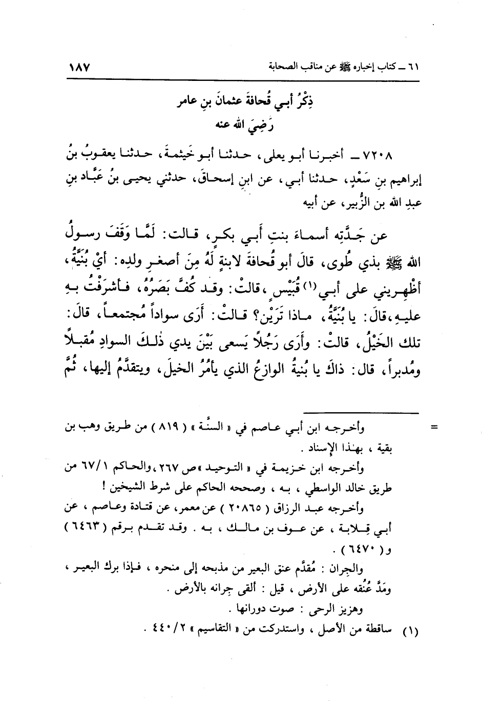 7208- أَخْبَرَنَا أَبُو يَعْلَى حَدَّثَنَا أَبُو خَيْثَمَةَ حَدَّثَنَا يَعْقُوبُ بْنُ إِبْرَاهِيمَ بْنِ سَعْدٍ حَدَّثَنَا أَبِي عَنِ ابْنِ إِسْحَاقَ حَدَّثَنِي يَحْيَى بْنِ عَبَّادِ بْنِ عَبْدِ اللَّهِ بْنِ الزُّبَيْرِ عَنْ أَبِيهِ عَنْ جَدَّتِهِ أَسْمَاءَ بِنْتِ أَبِي بَكْرٍ قَالَتْ: لَمَّا وَقَفَ رَسُولُ اللَّهِ صَلَّى اللَّهُ عَلَيْهِ وَسَلَّمَ بِذِي طُوًى قَالَ أَبُو قُحَافَةَ لَابْنَةٍ لَهُ مِنْ أَصْغَرِ وَلَدِهِ: أَيْ بُنَيَّةُ أَظْهِرِينِي عَلَى أَبِي قُبيس,1 قَالَتْ: وَقَدْ كُفَّ بَصَرُهُ فَأَشْرَفْتُ بِهِ عَلَيْهِ, قَالَ: يَا بُنَيَّةُ مَاذَا تَرَيْنَ؟ قَالَتْ: أَرَى سَوَادًا مُجْتَمِعًا, قَالَ: تِلْكَ الْخَيْلُ, قَالَتْ: وَأَرَى رَجُلًا يَسْعَى بَيْنَ يَدَيْ ذَلِكَ السَّوَادِ مُقْبِلًا وَمُدْبِرًا, قَالَ: ذَاكَ يَا بُنَيَّةُ الْوَازِعُ الَّذِي يَأْمُرُ الْخَيْلَ وَيَتَقَدَّمُ إليها ثم