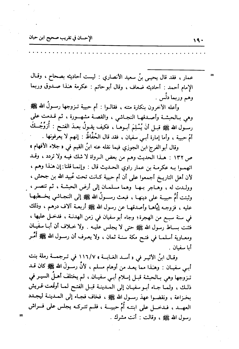 وقال أبو الفرج ابن الجوزي فيما نقله عنه ابن القيم في "جلاء الأفهام" ص132: هذا الحديث وهم من بعض الرواة لاشكفيه ولاتردد، وقد اتهموا به عكرمة بن عمار راوي الحديث قال: وإنما قلنا: إن هذا وهم، لان أهل التاريخ أجمعوا على أن أم حبيبة كانت تحت عبيد الله بن جحش، وولدت له، وهاجر بها وهما مسلمان إلى أرض الحبشة، ثم تنصر، وثبتت أم حبيبة على دينها، فبعث رسول الله صلى الله عليه وسلم إلى النجاشي يخطبها عليه، فزوجه إياها وأصدقها عن رسول الله صلى الله عليه وسلم أربعة آلاف درهم، وذلك في سنة سبع من الهجرة، وجاء أبو سفيان في زمن الهدنة، فدخل عليها، فثنت بساط رسول الله صلى الله عليه وسلم حتى لايجلس عليه. ولاخلاف أن أبا سفيان ومعاوية اسلما في فتح مكة سنة ثمان، ولايعرف أن رسول الله صلى الله عليه وسلم أمر أبا سفيان.