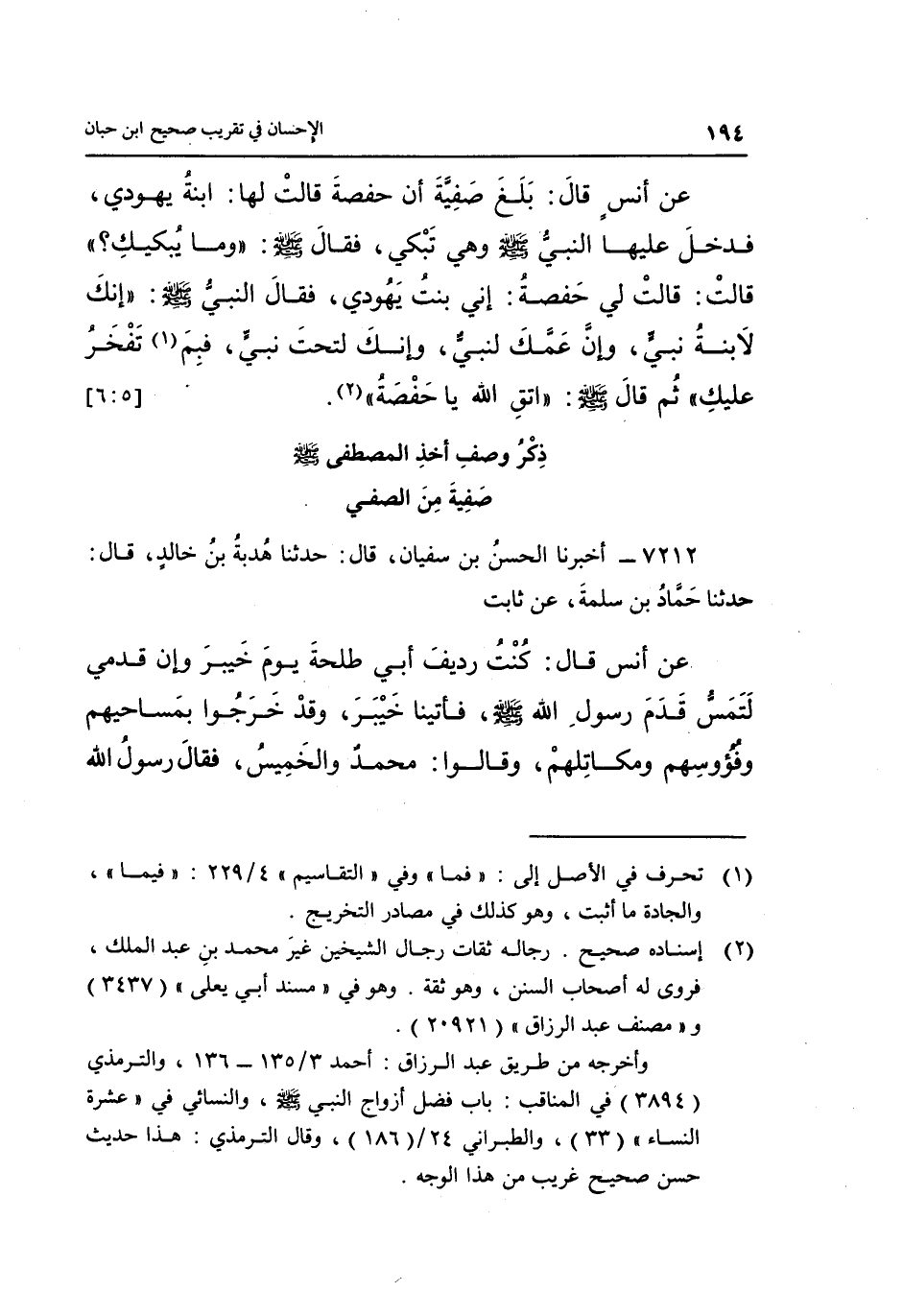 عَنْ أَنَسٍ قَالَ: بَلَغَ صَفِيَّةَ أَنَّ حَفْصَةَ قَالَتْ لَهَا: ابْنَةُ يَهُودِيٍّ فَدَخَلَ عَلَيْهَا النَّبِيُّ صَلَّى اللَّهُ عَلَيْهَا وَسَلَّمَ وَهِيَ تَبْكِي, فَقَالَ صَلَّى اللَّهُ عَلَيْهِ وَسَلَّمَ: "وَمَا يُبْكِيكِ"؟ قَالَتْ: قَالَتْ لِي حَفْصَةُ: إِنِّي بِنْتُ يَهُودِيٍّ, فَقَالَ النَّبِيُّ صَلَّى اللَّهُ عَلَيْهِ وَسَلَّمَ: "إِنَّكِ لَابْنَةُ نَبِيٍّ وَإِنَّ عَمَّكِ لِنَبِيٌّ وَإِنَّكِ لَتَحْتَ نَبِيٍّ فَبِمَ1 تَفْخَرُ عَلَيْكِ", ثُمَّ قَالَ صَلَّى اللَّهُ عليه وسلم: "اتق الله يا حفصة" 2. [5: 6]