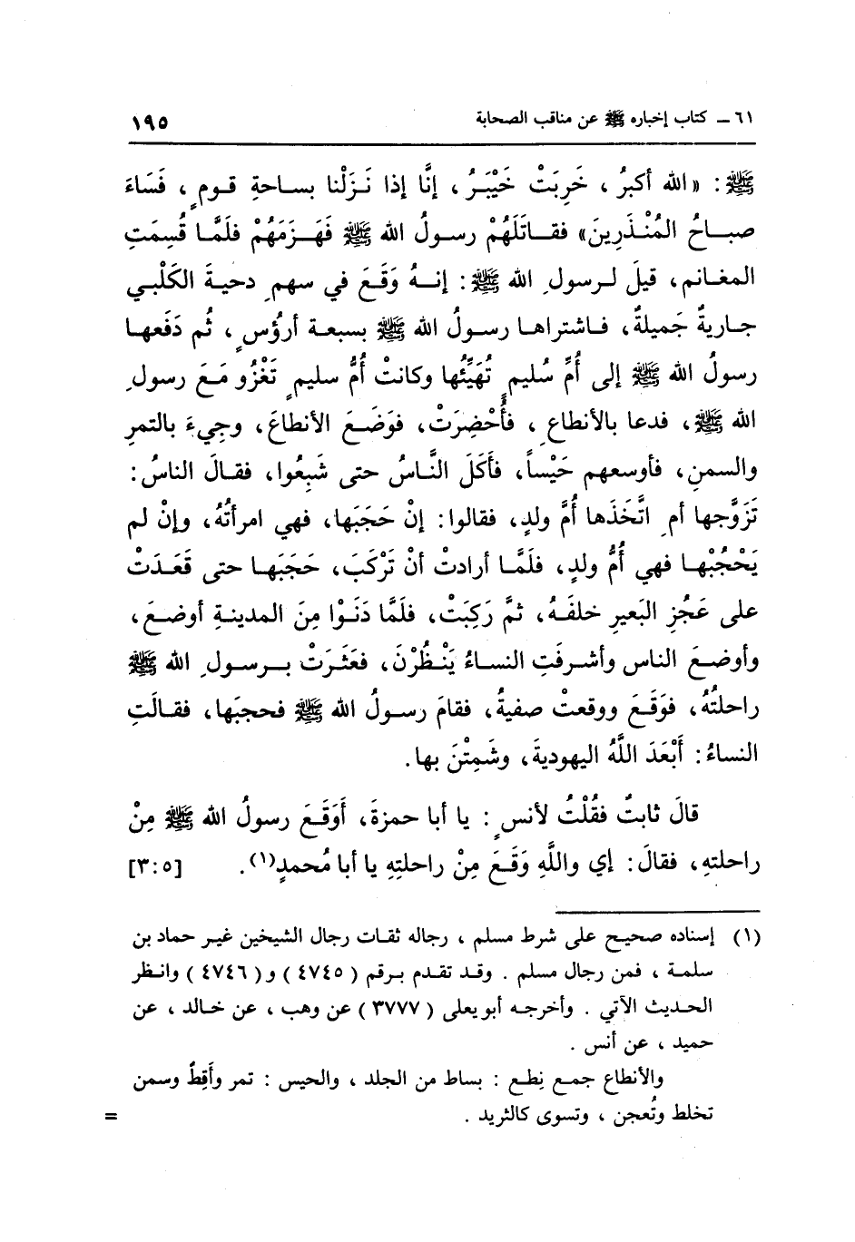 قَالَ ثَابِتٌ: فَقُلْتُ لِأَنَسٍ: يَا أَبَا حَمْزَةَ أَوَقَعَ رَسُولُ اللَّهِ صَلَّى اللَّهُ عَلَيْهِ وَسَلَّمَ مِنْ رَاحِلَتِهِ, فَقَالَ: إِي وَاللَّهِ وَقَعَ مِنْ رَاحِلَتِهِ يَا أبا محمد1. [5: 3]