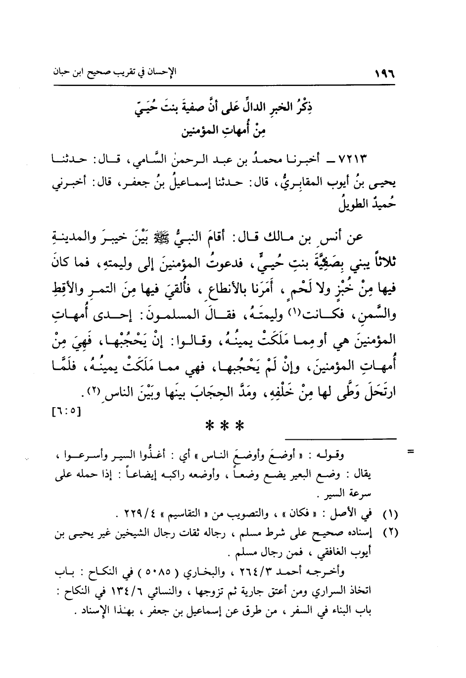 7213- أَخْبَرَنَا مُحَمَّدُ بْنُ عَبْدِ الرَّحْمَنِ السَّامِيُّ قَالَ حَدَّثَنَا يَحْيَى بْنُ أَيُّوبَ الْمَقَابِرِيُّ قَالَ: حَدَّثَنَا إِسْمَاعِيلُ بْنُ جَعْفَرٍ قَالَ: أَخْبَرَنِي حُمَيْدٌ الطَّوِيلُ عَنْ أَنَسِ بْنِ مَالِكٍ قَالَ: أَقَامَ النَّبِيُّ صَلَّى اللَّهُ عَلَيْهِ وَسَلَّمَ بَيْنَ خَيْبَرَ وَالْمَدِينَةِ ثَلَاثًا يَبْنِي بِصَفِيَّةَ بنت حيي فدعوت المؤمنين إلى وليمة فَمَا كَانَ فِيهَا مِنْ خُبْزٍ وَلَا لَحْمٍ أَمَرَنَا بِالْأَنْطَاعِ فَأُلْقِيَ فِيهَا مِنَ التَّمْرِ وَالْأَقِطِ وَالسَّمْنِ فَكَانَتْ1 وَلِيمَتَهُ فَقَالَ الْمُسْلِمُونَ: إِحْدَى أُمَّهَاتِ الْمُؤْمِنِينَ هِيَ أَوْ مِمَّا مَلَكَتْ يَمِينُهُ, وَقَالُوا: إِنْ يَحْجُبْهَا فَهِيَ مِنَ أُمَّهَاتِ الْمُؤْمِنِينَ وَإِنْ لَمْ يَحْجُبْهَا فَهِيَ مِمَّا مَلَكَتْ يَمِينُهُ فَلَمَّا ارْتَحَلَ وَطَّى لَهَا مِنْ خَلْفِهِ وَمَدَّ الْحِجَابَ بينها وبين الناس2. [5: 6]