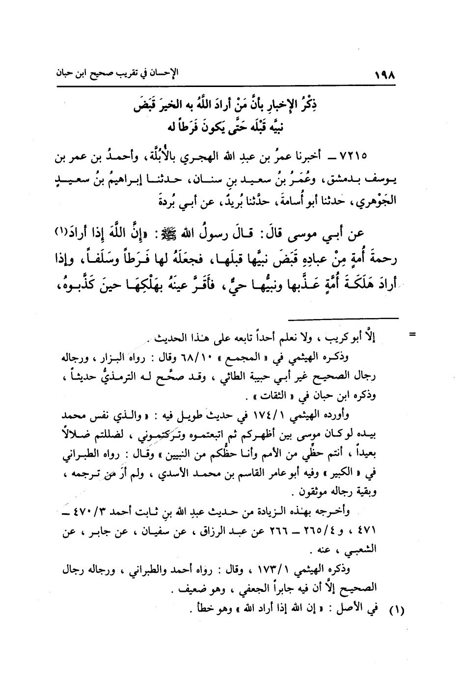 7215- أَخْبَرَنَا عُمَرُ بْنُ عَبْدِ اللَّهِ الْهَجَرِيُّ بِالْأُبُلَّةِ وَأَحْمَدُ بْنُ عُمَرَ بْنِ يُوسُفَ بِدِمَشْقَ وَعُمَرُ بْنُ سَعِيدِ بْنِ سِنَانٍ حَدَّثَنَا إِبْرَاهِيمُ بْنُ سَعِيدٍ الْجَوْهَرِيُّ حَدَّثَنَا أَبُو أُسَامَةَ حَدَّثَنَا يَزِيدُ عَنْ أَبِي بُرْدَةَ عَنْ أَبِي مُوسَى قَالَ: قَالَ رَسُولُ اللَّهِ صَلَّى اللَّهُ عَلَيْهِ وَسَلَّمَ: "إِنَّ اللَّهَ إِذَا أَرَادَ 1 رَحْمَةَ أُمَّةٍ مِنْ عِبَادِهِ قَبَضَ نَبِيَّهَا قَبْلَهَا فَجَعَلَهُ لَهَا فَرَطًا وَسَلَفًا وَإِذَا أَرَادَ هلكةَ أمةٍ عَذَّبَهَا وَنَبِيُّهَا حَيٌّ فَأَقَرَّ عَيْنَهُ بِهَلْكِهَا حِينَ كَذَّبُوهُ،