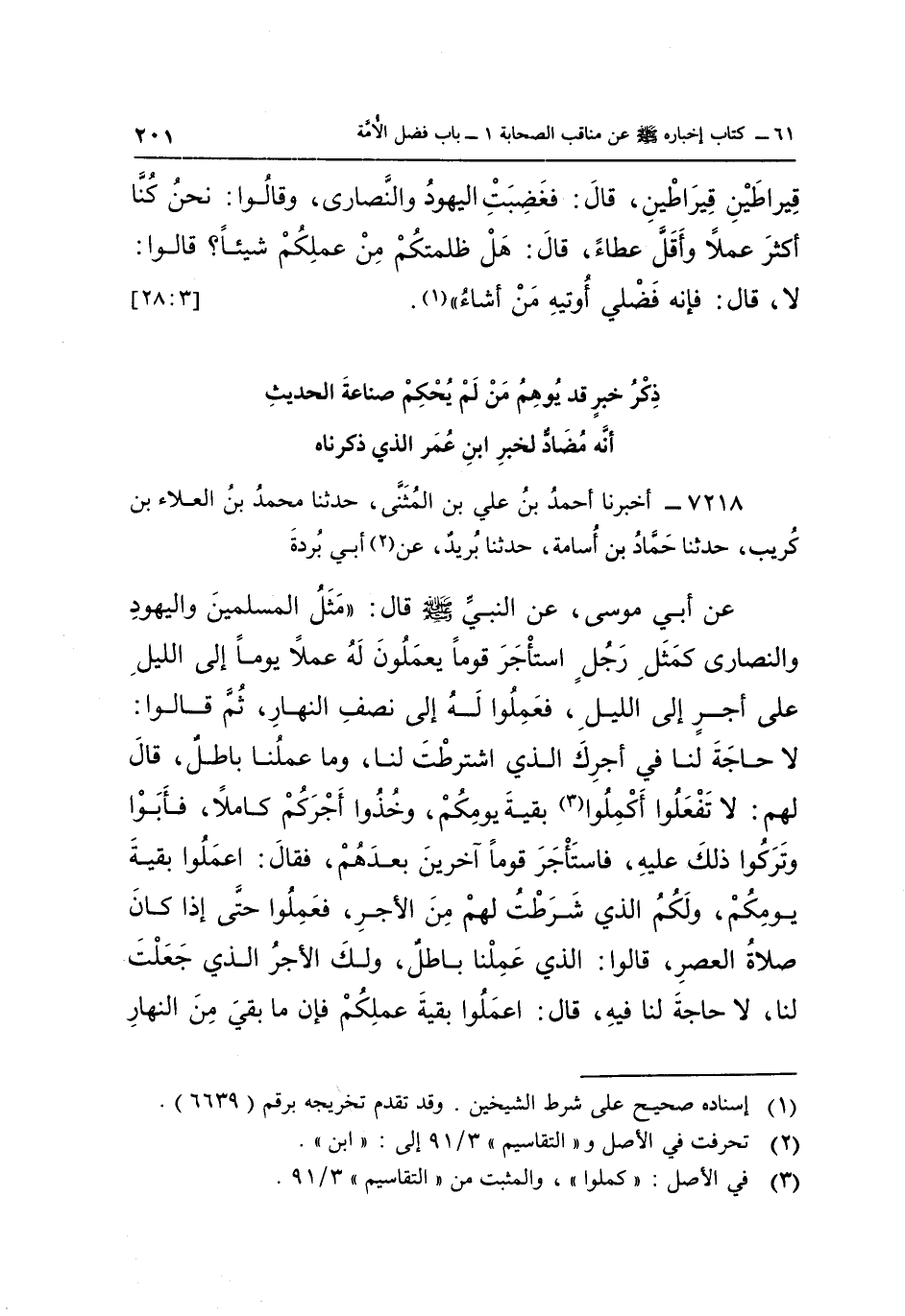 7218- أَخْبَرَنَا أَحْمَدُ بْنُ عَلِيِّ بْنِ الْمُثَنَّى حَدَّثَنَا مُحَمَّدُ بْنُ الْعَلَاءِ بْنِ كُرَيْبٍ حَدَّثَنَا حَمَّادُ بْنُ أُسَامَةَ حَدَّثَنَا بُرَيْدٌ عَنْ2 أَبِي بُرْدَةَ عَنْ أَبِي مُوسَى عَنِ النَّبِيِّ صَلَّى اللَّهُ عَلَيْهِ وَسَلَّمَ قَالَ: "مَثَلُ الْمُسْلِمِينَ وَالْيَهُودِ وَالنَّصَارَى كَمَثَلِ رَجُلٍ اسْتَأْجَرَ قَوْمًا يَعْمَلُونَ لَهُ عَمَلًا يَوْمًا إِلَى اللَّيْلِ عَلَى أَجْرٍ إِلَى اللَّيْلِ, فَعَمِلُوا لَهُ إِلَى نِصْفِ النَّهَارِ ثُمَّ قَالُوا: لَا حَاجَةَ لَنَا فِي أَجْرِكَ الَّذِي اشْتَرَطْتَ لَنَا وَمَا عَمَلُنَا بَاطِلٌ قَالَ لَهُمْ: لَا تَفْعَلُوا أَكْمِلُوا3 بَقِيَّةَ يَوْمِكُمْ وَخُذُوا أَجْرَكُمْ كَامِلًا, فَأَبَوْا وَتَرَكُوا ذَلِكَ عَلَيْهِ فَاسْتَأْجَرَ قَوْمًا آخَرِينَ بَعْدَهُمْ, فَقَالَ: اعْمَلُوا بَقِيَّةَ يَوْمِكُمْ وَلَكُمُ الَّذِي شَرَطْتُ لَهُمْ مِنَ الْأَجْرِ, فَعَمِلُوا حَتَّى إِذَا كَانَ صَلَاةُ الْعَصْرِ قَالُوا: الَّذِي عَمِلْنَا بَاطِلٌ وَلَكَ الْأَجْرُ الَّذِي جَعَلْتَ لَنَا لَا حَاجَةَ لَنَا فِيهِ, قَالَ: اعْمَلُوا بَقِيَّةَ عَمَلِكُمْ فَإِنَّ مَا بَقِيَ مِنَ النَّهَارِ