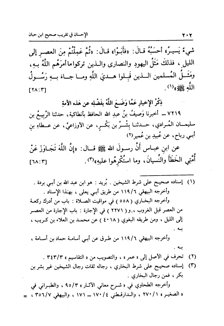 7219- أَخْبَرَنَا وَصِيفُ بْنُ عَبْدِ اللَّهِ الْحَافِظُ بِأَنْطَاكِيَةَ حَدَّثَنَا الرَّبِيعُ بْنُ سُلَيْمَانَ الْمُرَادِيُّ حَدَّثَنَا بِشْرُ بْنُ بَكْرٍ عَنِ الْأَوْزَاعِيِّ عَنِ عَطَاءِ بْنِ أَبِي رَبَاحٍ عَنْ عُبَيْدِ بْنِ عُمَيْرٍ1 عَنِ ابْنِ عَبَّاسٍ أَنَّ رَسُولَ اللَّهِ صَلَّى اللَّهُ عَلَيْهِ وَسَلَّمَ قَالَ: "إِنَّ اللَّهَ تَجَاوَزَ عَنْ أُمَّتِي الْخَطَأَ وَالنِّسْيَانَ وَمَا اسْتُكْرِهُوا عليه" 2. [3: 68]
