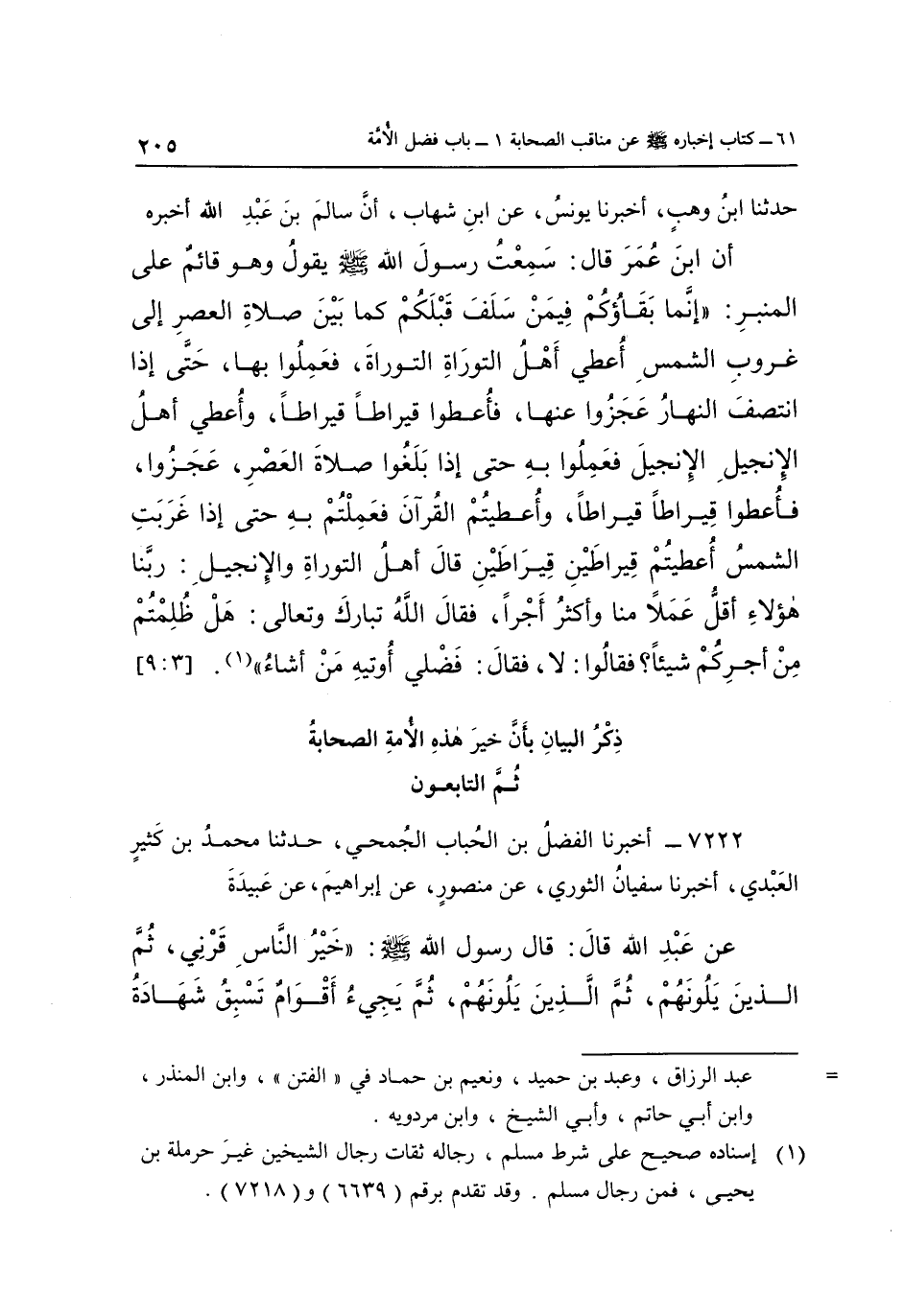 حَدَّثَنَا ابْنُ وَهْبٍ أَخْبَرَنَا يُونُسُ عَنِ ابْنِ شِهَابٍ أَنَّ سَالِمَ بْنَ عَبْدِ اللَّهِ أَخْبَرَهُ أَنَّ ابْنِ عُمَرَ قَالَ: سَمِعْتُ رَسُولَ اللَّهِ صَلَّى اللَّهُ عَلَيْهِ وَسَلَّمَ يَقُولُ وَهُوَ قَائِمٌ عَلَى الْمِنْبَرِ: "إِنَّمَا بَقَاؤُكُمْ فِيمَنْ سَلَفَ قَبْلَكُمْ كَمَا بَيْنَ صَلَاةِ الْعَصْرِ إِلَى غُرُوبِ الشَّمْسِ أُعْطِيَ أَهْلُ التَّوْرَاةِ التَّوْرَاةَ فَعَمِلُوا بِهَا حَتَّى إِذَا انْتَصَفَ النَّهَارُ عَجَزُوا عَنْهَا فَأُعْطُوا قِيرَاطًا قِيرَاطًا وَأُعْطِيَ أَهْلُ الْإِنْجِيلِ الْإِنْجِيلَ فَعَمِلُوا بِهِ حَتَّى إِذَا بَلَغُوا صَلَاةَ الْعَصْرِ عَجَزُوا فَأُعْطُوا قِيرَاطًا قِيرَاطًا وَأُعْطِيتُمُ الْقُرْآنَ فَعَمِلْتُمْ بِهِ حَتَّى إِذَا غَرَبَتِ الشَّمْسُ أُعْطِيتُمْ قِيرَاطَيْنِ قِيرَاطَيْنِ قَالَ أَهْلُ التَّوْرَاةِ وَالْإِنْجِيلِ: رَبَّنَا هَؤُلَاءِ أَقَلُّ عَمَلًا مِنَّا وَأَكْثَرُ أَجْرًا فَقَالَ اللَّهُ تَبَارَكَ وَتَعَالَى: هَلْ ظُلِمْتُمْ مِنْ أَجْرِكُمْ شَيْئًا؟ فَقَالُوا: لَا, فقال: فضلي أوتيه من أشاء" 1. [3: 9]