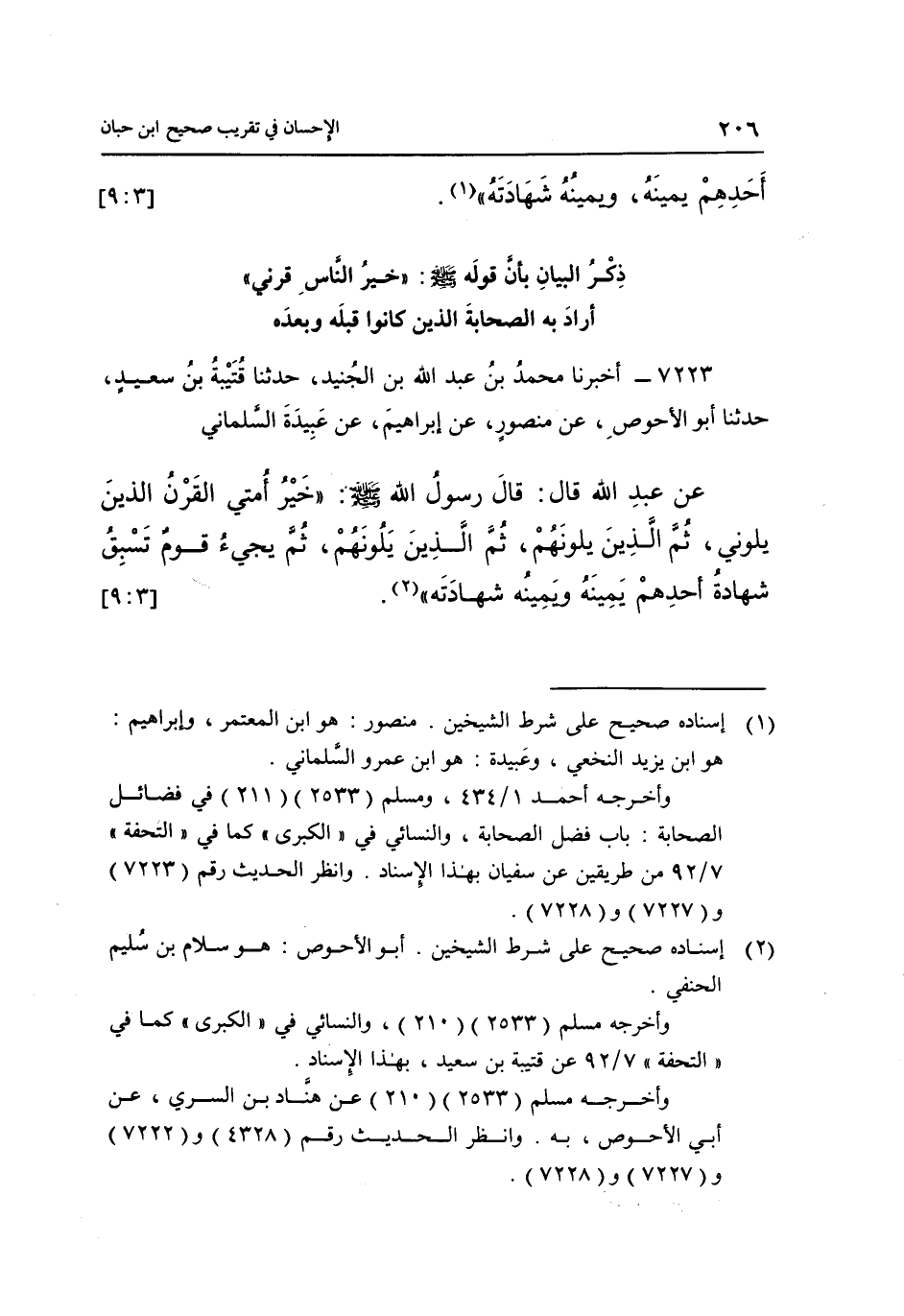 7223- أَخْبَرَنَا مُحَمَّدُ بْنُ عَبْدِ اللَّهِ بْنِ الْجُنَيْدِ حَدَّثَنَا قُتَيْبَةُ بْنُ سَعِيدٍ حَدَّثَنَا أَبُو الْأَحْوَصِ عَنْ مَنْصُورٍ عَنْ إِبْرَاهِيمَ عَنْ عُبَيْدَةَ السَّلْمَانِيِّ عَنْ عَبْدِ اللَّهِ قَالَ: قَالَ رَسُولُ اللَّهِ صَلَّى اللَّهُ عَلَيْهِ وَسَلَّمَ: "خَيْرُ أُمَّتِي الْقَرْنُ الَّذِينَ يَلُونِي ثُمَّ الَّذِينَ يَلُونَهُمْ ثُمَّ الَّذِينَ يَلُونَهُمْ ثُمَّ يَجِيءُ قوم تسبق شهادة أحدهم يمينه ويمينه شهادته" 1. [3: 9]