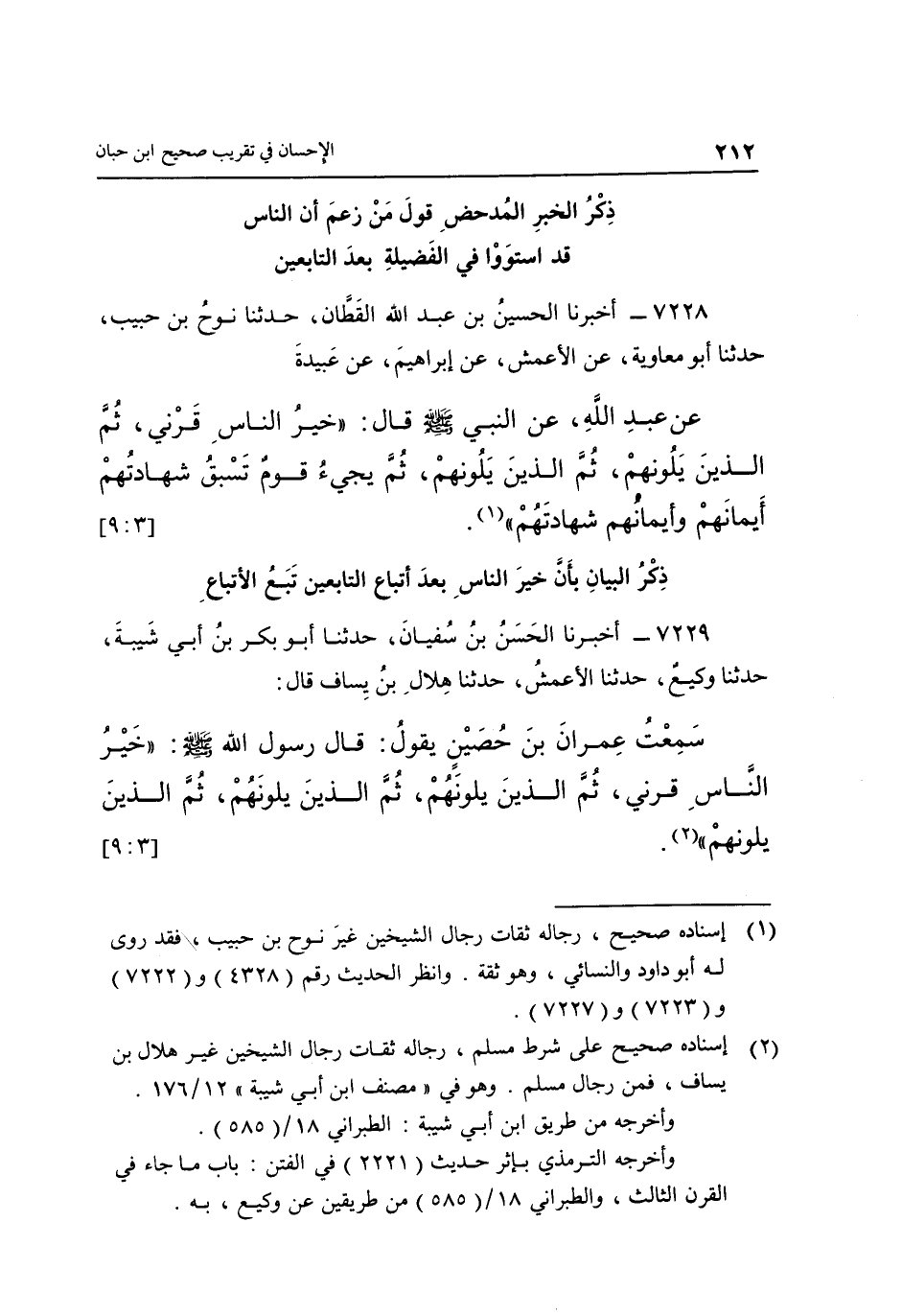 7228- أَخْبَرَنَا الْحُسَيْنُ بْنُ عَبْدِ اللَّهِ الْقَطَّانُ حَدَّثَنَا نُوحُ بْنُ حَبِيبٍ حَدَّثَنَا أَبُو مُعَاوِيَةَ عَنِ الْأَعْمَشِ عَنْ إِبْرَاهِيمَ عَنْ عُبَيْدَةَ عَنْ عَبْدِ اللَّهِ عَنِ النَّبِيِّ صَلَّى اللَّهُ عَلَيْهِ وَسَلَّمَ قَالَ: "خَيْرُ النَّاسِ قَرْنِي ثُمَّ الَّذِينَ يَلُونَهُمْ ثُمَّ الَّذِينَ يَلُونَهُمْ ثُمَّ يَجِيءُ قَوْمٌ تَسْبِقُ شهادتهم ايمانهم وايمانهم شهادتهم" 1. [3: 9]