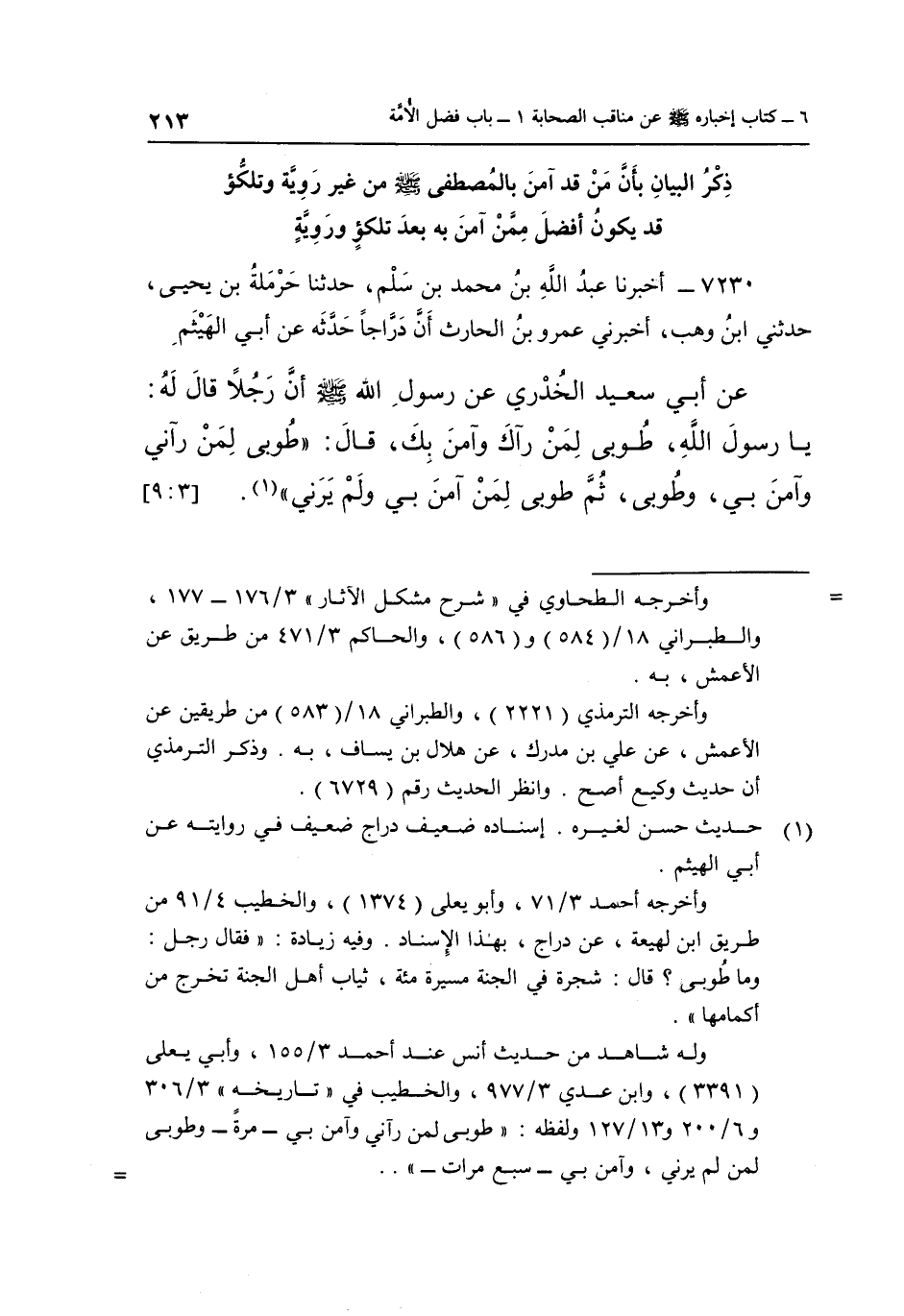 7230- أَخْبَرَنَا عَبْدُ اللَّهِ بْنُ مُحَمَّدِ بْنِ سَلْمٍ حَدَّثَنَا حَرْمَلَةُ بْنُ يَحْيَى حدثني بن وَهْبٍ أَخْبَرَنِي عَمْرُو بْنُ الْحَارِثِ أَنَّ دَرَّاجًا حَدَّثَهُ عَنْ أَبِي الْهَيْثَمِ عَنْ أَبِي سَعِيدٍ الْخُدْرِيِّ عَنْ رَسُولِ اللَّهِ صَلَّى اللَّهُ عَلَيْهِ وَسَلَّمَ أَنَّ رُجُلًا قَالَ لَهُ: يَا رَسُولَ اللَّهِ، طُوبَى لِمَنْ رَآكَ وَآمَنَ بِكَ، قَالَ: "طُوبَى لِمَنْ رَآنِي وَآمَنَ بِي وَطُوبَى ثُمَّ طوبى لمن آمن بي ولم يرني" 1. [3: 9]