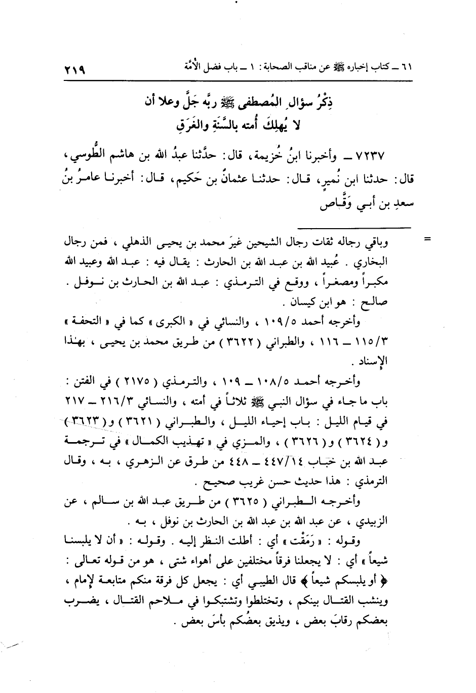 7237- وأخبرنا بْنِ خُزَيْمَةَ قَالَ: حَدَّثَنَا عَبْدُ اللَّهِ بْنُ هَاشِمٍ الطُّوسِيُّ قَالَ: حَدَّثَنَا ابْنُ نُمَيْرٍ قَالَ: حَدَّثَنَا عُثْمَانُ بْنُ حَكِيمٍ قَالَ: أَخْبَرَنَا عَامِرِ بْنِ سَعْدِ بْنِ أَبِي وَقَّاصٍ