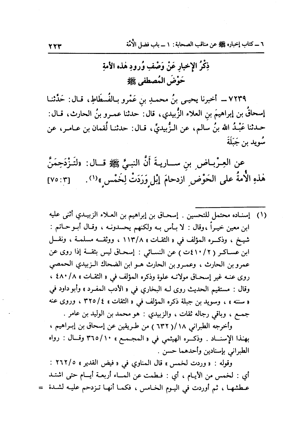 7239- أَخْبَرَنَا يَحْيَى بْنُ مُحَمَّدِ بْنِ عَمْرٍو بِالْفُسْطَاطِ قَالَ: حَدَّثَنَا إِسْحَاقُ بْنُ إِبْرَاهِيمَ بْنِ الْعَلَاءِ الزُّبَيْدِيُّ قَالَ: حَدَّثَنَا عَمْرُو بْنُ الْحَارِثِ قَالَ: حَدَّثَنَا عَبْدُ اللَّهِ بْنُ سَالِمٍ عَنِ الزُّبَيْدِيِّ قَالَ: حَدَّثَنَا لُقْمَانُ بْنُ عَامِرٍ عَنْ سُوَيْدِ بْنِ جَبَلَةَ عَنِ الْعِرْبَاضِ بْنِ سَارِيَةَ أَنَّ النَّبِيَّ صَلَّى اللَّهُ عَلَيْهِ وَسَلَّمَ قَالَ: "لَتَزْدَحِمَنَّ هَذِهِ الْأُمَّةُ عَلَى الحوض ازدحام إبل وردت لخمس" 1. [3: 75]