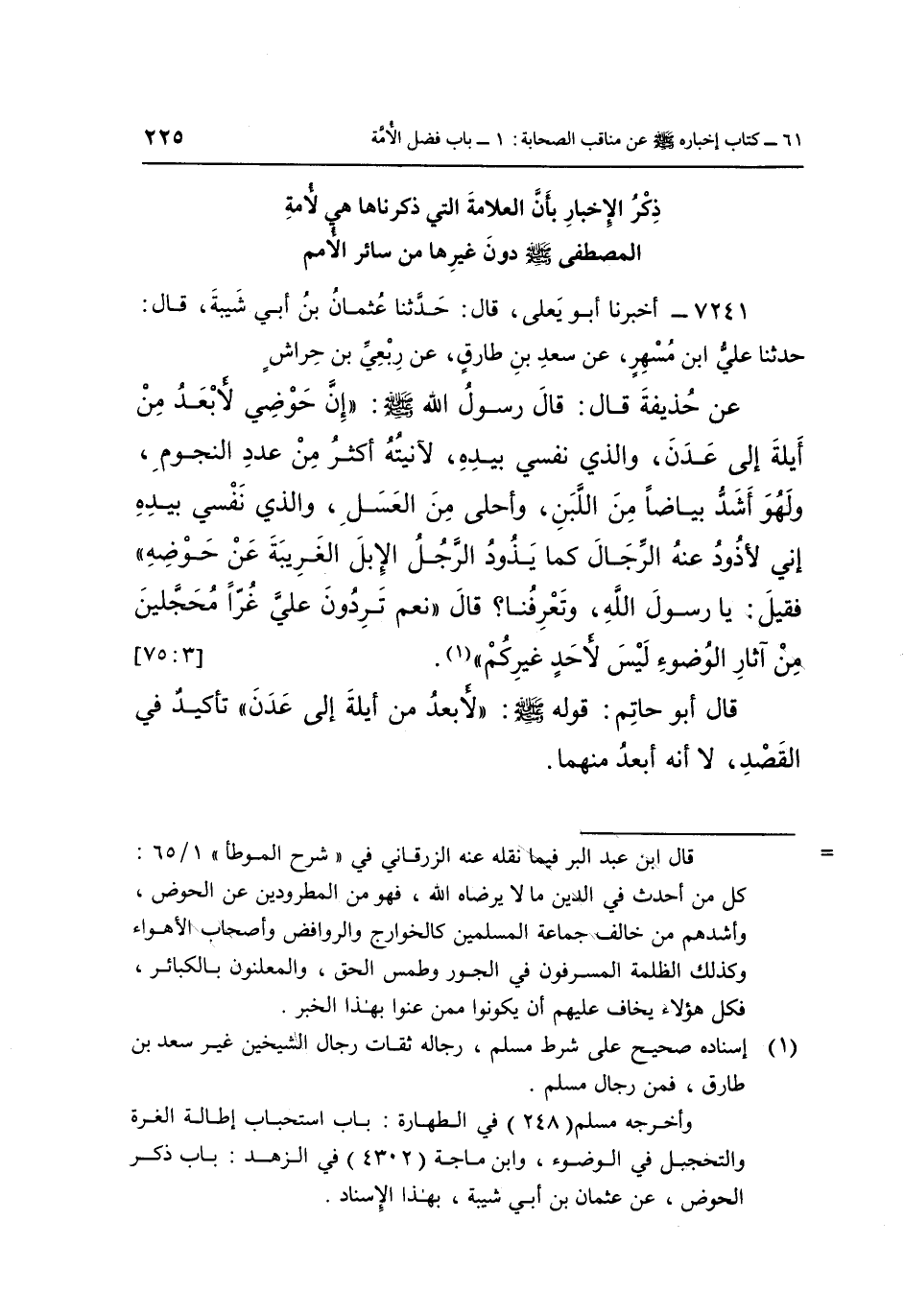 7241- أَخْبَرَنَا أَبُو يَعْلَى قَالَ: حَدَّثَنَا عُثْمَانُ بْنُ أبي سيبة قَالَ: حَدَّثَنَا عَلِيُّ بْنُ مُسْهِرٍ عَنْ سَعْدِ بْنِ طَارِقٍ عَنْ رِبْعِيِّ بْنِ حِرَاشٍ عَنْ حُذَيْفَةَ قَالَ: قَالَ رَسُولُ اللَّهِ صَلَّى اللَّهُ عَلَيْهِ وَسَلَّمَ: "إِنَّ حَوْضِي لَأَبْعَدُ مِنْ أَيْلَةَ إِلَى عَدْنَ وَالَّذِي نَفْسِي بِيَدِهِ لَآنِيَتُهُ أَكْثَرُ مِنْ عَدَدِ النُّجُومِ وَلَهُوَ أَشَدُّ بَيَاضًا مِنَ اللَّبَنِ وَأَحْلَى مِنَ الْعَسَلِ وَالَّذِي نَفْسِي بِيَدِهِ إِنِّي لَأَذُودُ عَنْهُ الرِّجَالَ كَمَا يَذُودُ الرَّجُلُ الْإِبِلَ الْغَرِيبَةَ عَنْ حَوْضِهِ", فَقِيلَ: يَا رَسُولَ اللَّهِ وَتَعْرِفُنَا قَالَ: "نَعَمْ تَرِدُونَ عَلَيَّ غُرًّا مُحَجَّلِينَ مِنْ آثَارِ الْوُضُوءِ لَيْسَ لِأَحَدٍ غَيْرِكُمْ" 1. [3: 75]