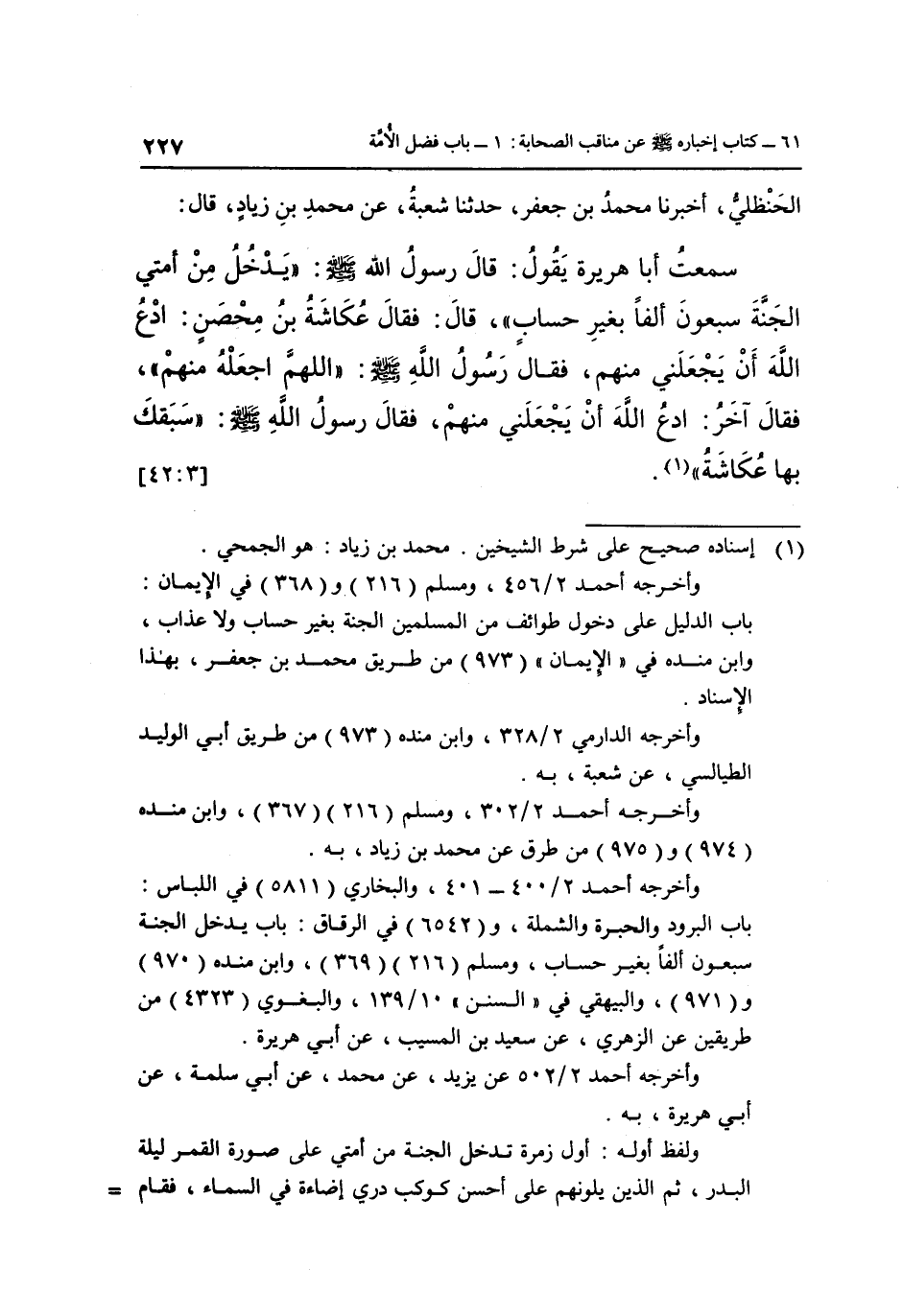 الْحَنْظَلِيُّ أَخْبَرَنَا مُحَمَّدُ بْنُ جَعْفَرٍ حَدَّثَنَا شُعْبَةُ عَنْ مُحَمَّدِ بْنِ زِيَادٍ، قَالَ: سَمِعْتُ أَبَا هُرَيْرَةَ يَقُولُ: قَالَ رَسُولُ اللَّهِ صَلَّى اللَّهُ عَلَيْهِ وَسَلَّمَ: "يَدْخُلُ مِنْ أُمَّتِي الْجَنَّةَ سَبْعُونَ أَلْفًا بِغَيْرِ حِسَابٍ"، قَالَ: فَقَالَ عُكَّاشَةُ بْنُ مِحْصَن ادْعُ اللَّهَ أَنْ يَجْعَلَنِي مِنْهُمْ, فَقَالَ رَسُولُ اللَّهِ صَلَّى اللَّهُ عَلَيْهِ وَسَلَّمَ: "اللَّهُمَّ اجْعَلْهُ مِنْهُمْ" فَقَالَ آخَرُ: ادْعُ اللَّهَ أَنْ يَجْعَلَنِي مِنْهُمْ فَقَالَ رَسُولُ اللَّهِ صَلَّى اللَّهُ عَلَيْهِ وَسَلَّمَ: "سبقك بها عكاشة" 1. [3: 42]