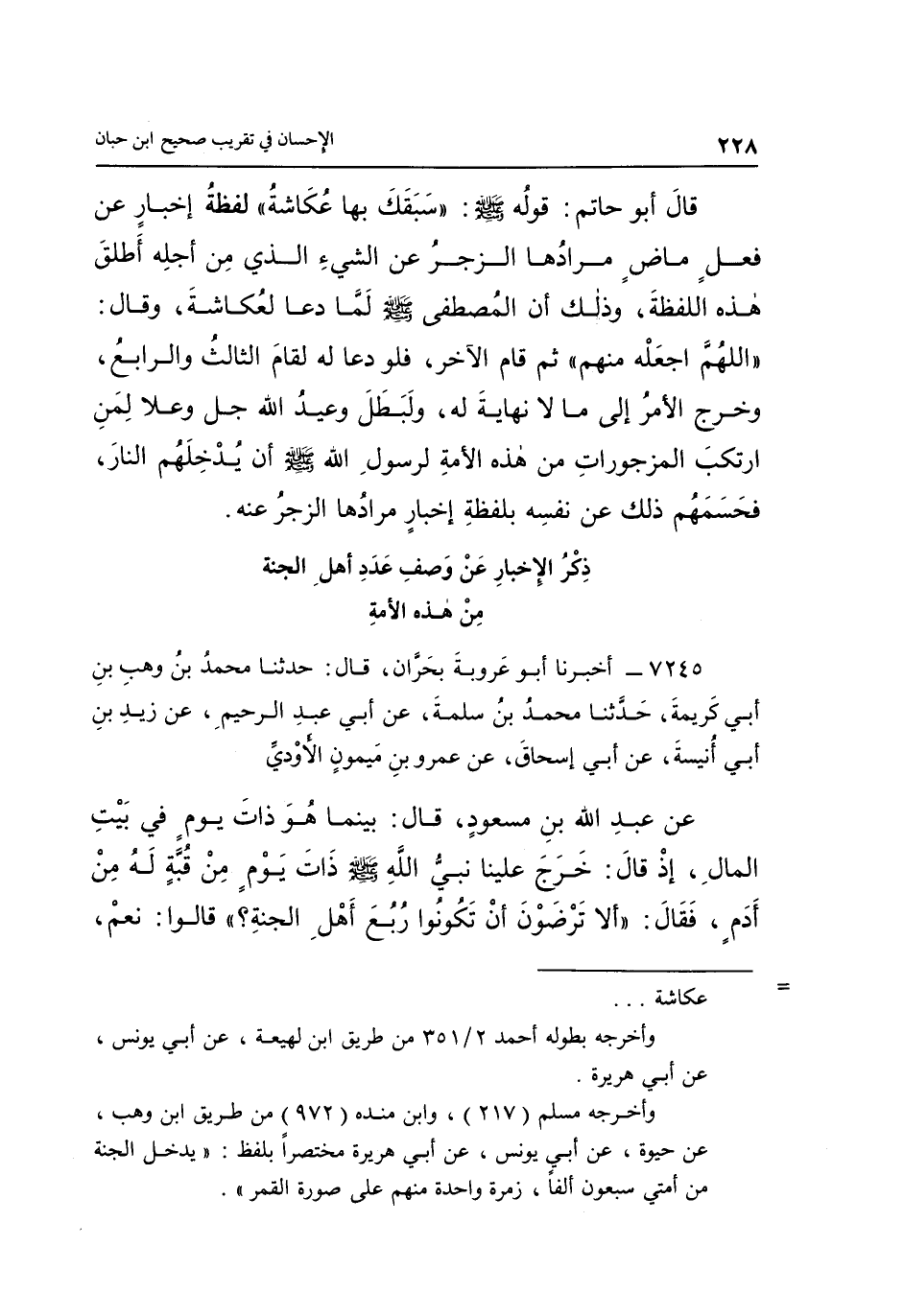 قَالَ أَبُو حَاتِمٍ: قَوْلُهُ صَلَّى اللَّهُ عَلَيْهِ وسلم: "سبقك بها عكاشة", لفظ إِخْبَارٍ عَنْ فِعْلٍ مَاضٍ مُرَادُهَا الزَّجْرُ عَنِ الشَّيْءِ الَّذِي مِنْ أَجْلِهِ أَطْلَقَ هَذِهِ اللَّفْظَةَ وَذَلِكَ أَنَّ الْمُصْطَفَى صَلَّى اللَّهُ عَلَيْهِ وَسَلَّمَ لَمَّا دَعَا لِعُكَّاشَةَ وَقَالَ: "اللَّهُمَّ اجْعَلْهُ مِنْهُمْ", ثُمَّ قَامَ الْآخَرُ فَلَوْ دَعَا لَهُ لَقَامَ الثَّالِثُ وَالرَّابِعُ وَخَرَجَ الْأَمْرُ إِلَى مَا لَا نِهَايَةَ لَهُ وَلَبَطَلَ وَعِيدُ اللَّهِ جَلَّ وَعَلَا لِمَنِ ارْتَكَبَ الْمَزْجُورَاتِ مِنْ هَذِهِ الْأُمَّةِ لِرَسُولِ اللَّهِ صَلَّى اللَّهُ عَلَيْهِ وَسَلَّمَ إِنَّ يُدْخِلَهُمُ النَّارَ فَحَسَمَهُمْ ذَلِكَ عَنْ نَفْسِهِ بِلَفْظَةِ إِخْبَارٍ مرادها الزجر عنه.
