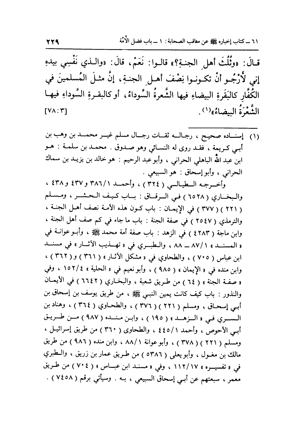 قَالَ: "وَثُلُثُ أَهْلِ الْجَنَّةِ؟ " قَالُوا: نَعَمْ، قَالَ: "وَالَّذِي نَفْسِي بِيَدِهِ إِنِّي لَأَرْجُو أَنْ تَكُونُوا نِصْفَ أَهْلِ الْجَنَّةِ إِنَّ مَثَلَ الْمُسْلِمِينَ فِي الْكُفَّارِ كَالْبَقَرَةِ الْبَيْضَاءِ فِيهَا الشَّعْرَةُ السَّوْدَاءُ أَوْ كالبقرة السوداء فيها الشعرة البيضاء" 1. [3: 78]