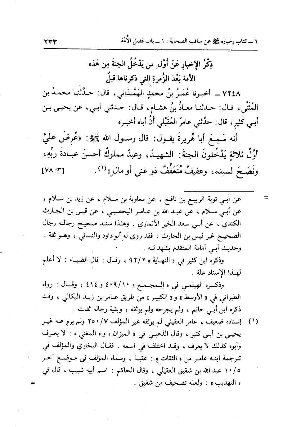 أَنَّهُ سَمِعَ أَبَا هُرَيْرَةَ يَقُولُ: قَالَ رَسُولُ اللَّهِ صَلَّى اللَّهُ عَلَيْهِ وَسَلَّمَ: "عُرِضَ عَلَيَّ أَوَّلُ ثَلَاثَةٍ يَدْخُلُونَ الْجَنَّةَ الشَّهِيدُ وَعَبْدٌ مَمْلُوكٌ أَحْسَنَ عِبَادَةَ رَبِّهِ وَنَصَحَ لِسَيِّدِهِ وَعَفِيفٌ مُتَعَفِّفٌ ذُو غِنًى أَوْ مَالٍ" 1. [3: 78]