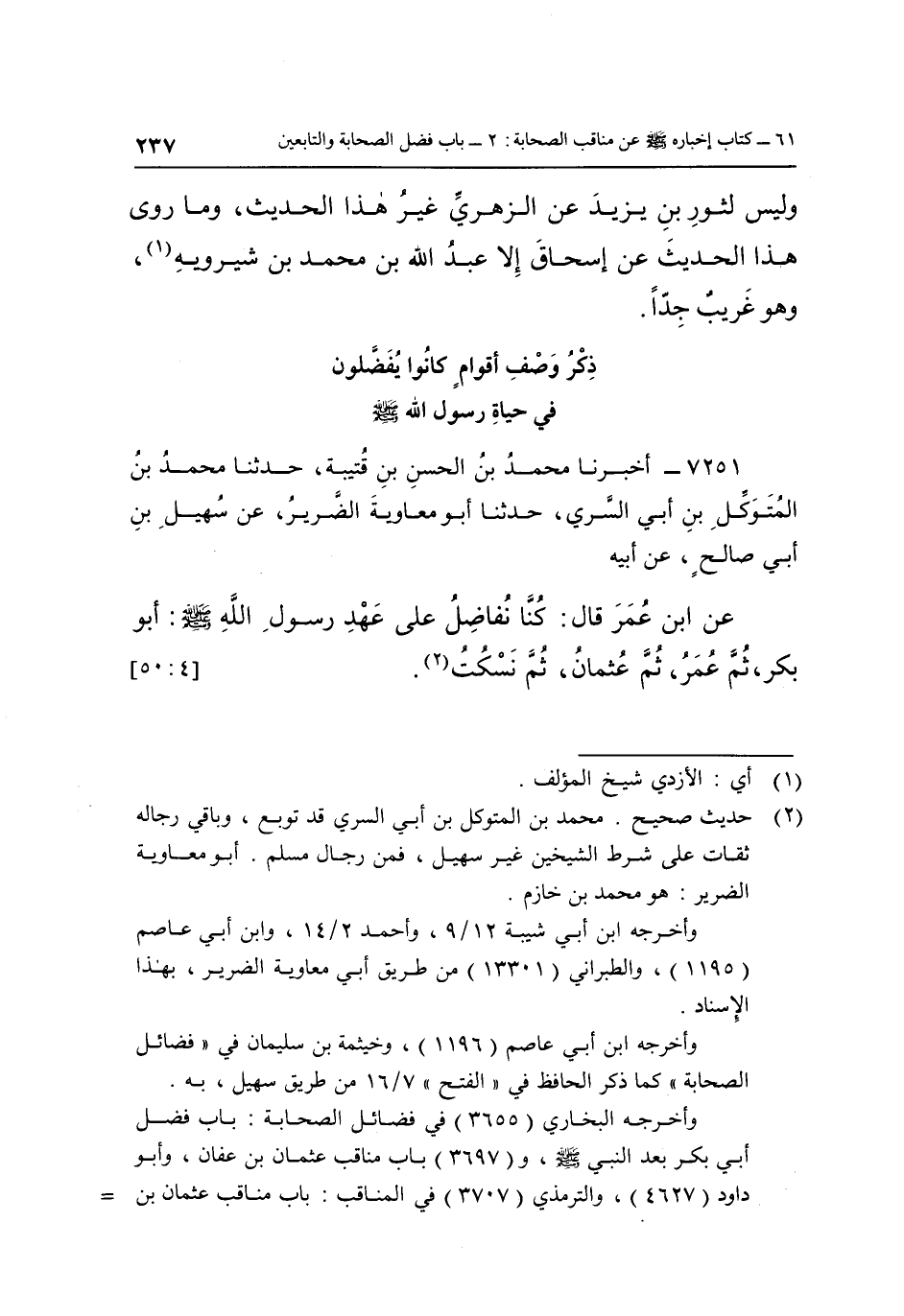 7251- أَخْبَرَنَا مُحَمَّدُ بْنُ الْحَسَنِ بْنِ قُتَيْبَةَ حَدَّثَنَا مُحَمَّدُ بْنُ الْمُتَوَكِّلِ بْنِ أَبِي السَّرِيِّ حَدَّثَنَا أَبُو مُعَاوِيَةَ الضَّرِيرُ عَنْ سُهَيْلِ بْنِ أَبِي صَالِحٍ عَنْ أَبِيهِ عَنِ ابْنِ عُمَرَ قَالَ: كُنَّا نُفَاضِلُ عَلَى عَهْدِ رَسُولِ اللَّهِ صَلَّى اللَّهُ عَلَيْهِ وَسَلَّمَ: أَبُو بَكْرٍ, ثُمَّ عُمَرُ, ثُمَّ عثمان, ثم نسكت1. [4: 50]