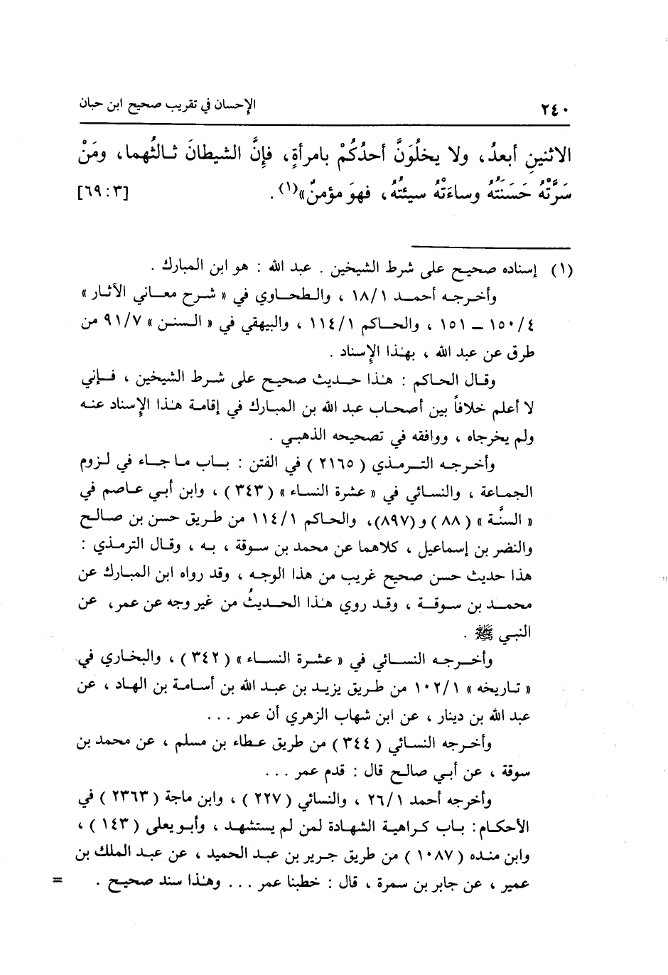الِاثْنَيْنِ أَبْعَدُ وَلَا يَخْلَوَنَّ أَحَدُكُمْ بِامْرَأَةٍ فَإِنَّ الشَّيْطَانَ ثَالِثُهُمَا وَمَنْ سَرَّتْهُ حَسَنَتُهُ وَسَاءَتْهُ سَيِّئَتُهُ فهو مؤمن" 1. [3: 69]