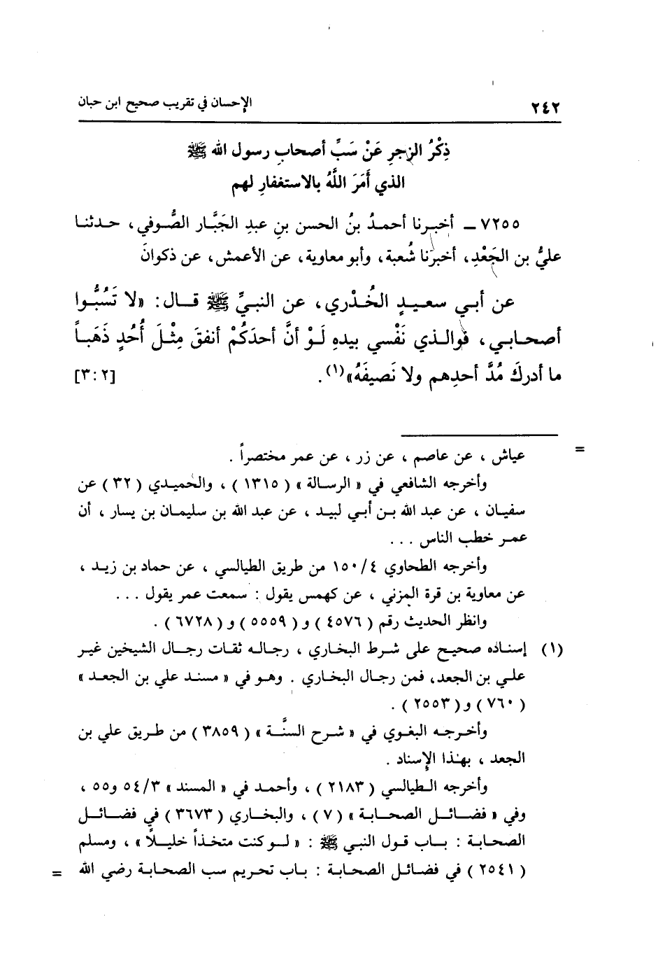 7255- أَخْبَرَنَا أَحْمَدُ بْنُ الْحَسَنِ بْنِ عَبْدِ الْجَبَّارِ الصُّوفِيُّ حَدَّثَنَا عَلِيُّ بْنُ الْجَعْدِ أَخْبَرَنَا شُعْبَةُ وَأَبُو مُعَاوِيَةَ عَنِ الْأَعْمَشِ عَنْ ذَكْوَانَ عَنْ أَبِي سَعِيدٍ الْخُدْرِيِّ عَنِ النَّبِيِّ صَلَّى اللَّهُ عَلَيْهِ وَسَلَّمَ قَالَ: "لَا تَسُبُّوا أَصْحَابِي فَوَالَّذِي نَفْسِي بِيَدِهِ لَوْ أَنَّ أَحَدَكُمْ أَنْفَقَ مِثْلَ أُحُدٍ ذَهَبًا مَا أَدْرَكَ مُدَّ أحدهم ولا نصيفه" 1. [2: 3]