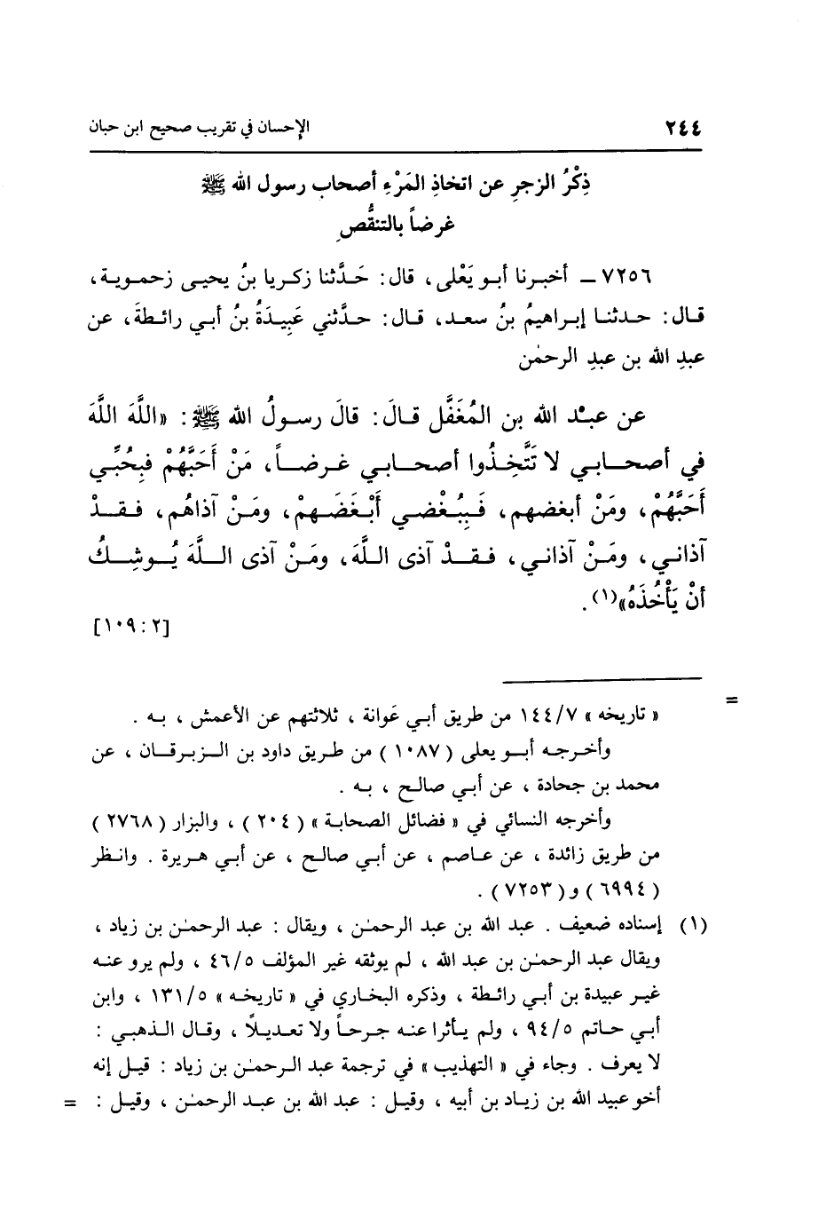 7256- أَخْبَرَنَا أَبُو يَعْلَى قَالَ حَدَّثَنَا زَكَرِيَّا بْنُ يَحْيَى زَحْمَوَيْهِ قَالَ حَدَّثَنَا إِبْرَاهِيمُ بْنُ سَعْدٍ قَالَ حَدَّثَنِي عُبَيْدَةُ بْنُ أَبِي رَائِطَةَ عَنْ عَبْدِ اللَّهِ بْنِ عَبْدِ الرَّحْمَنِ عَنْ عَبْدِ اللَّهِ بْنِ الْمُغَفَّلِ قَالَ: قَالَ رَسُولُ اللَّهِ صَلَّى اللَّهُ عَلَيْهِ وَسَلَّمَ: "اللَّهَ اللَّهَ فِي أَصْحَابِي لَا تَتَّخِذُوا أَصْحَابِي غَرَضًا مَنْ أَحَبَّهُمْ فَبِحُبِّي أَحَبَّهُمْ وَمَنْ أَبْغَضَهُمْ فَبِبُغْضِي أَبْغَضَهُمْ وَمَنْ آذاهم فقد آذاني ومن آذاني فقد آذ اللَّهَ وَمَنْ آذَى اللَّهَ يُوشِكُ أَنْ يَأْخُذَهُ" 1. [2: 109]
