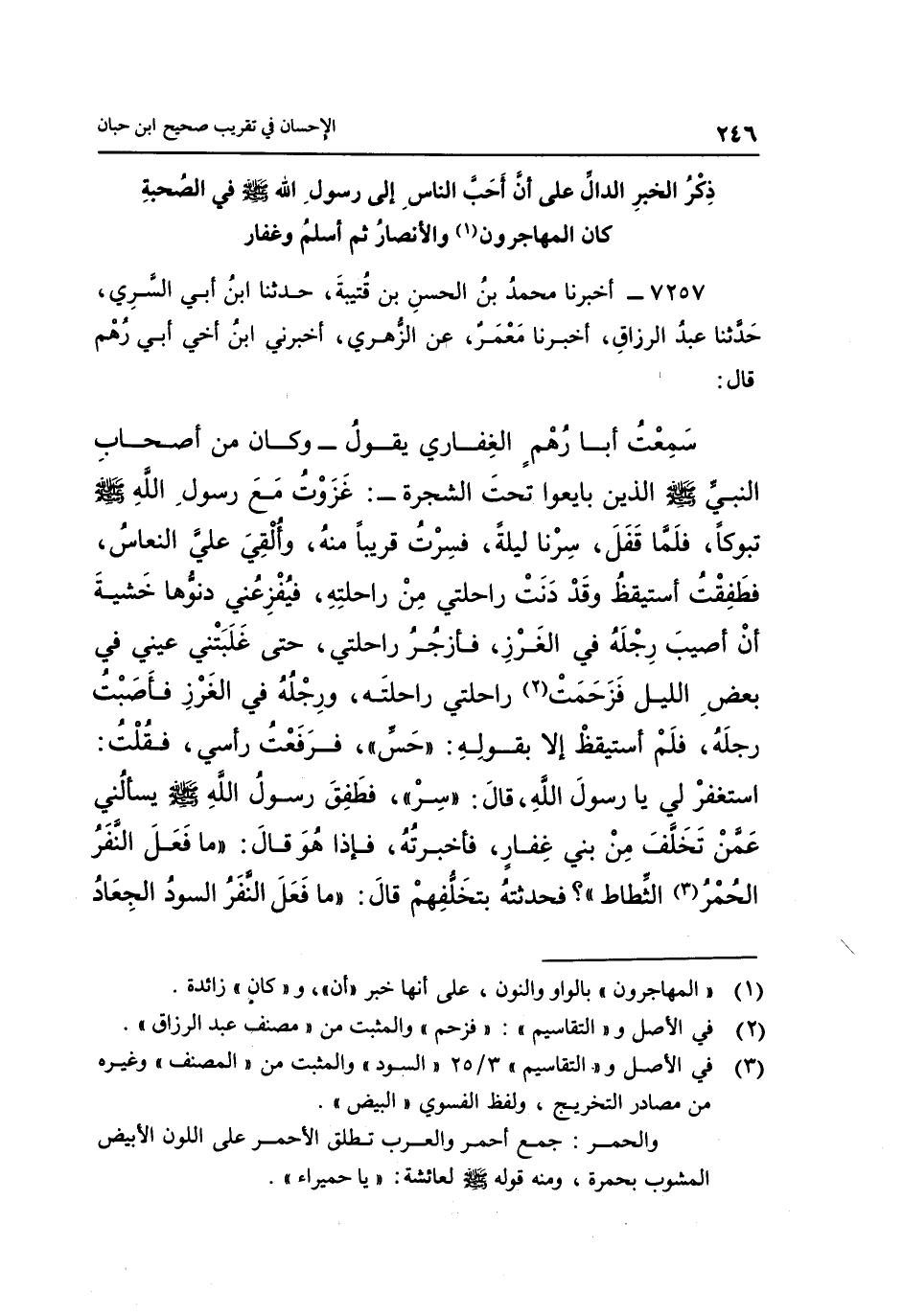 7257- أَخْبَرَنَا مُحَمَّدُ بْنُ الْحَسَنِ بْنِ قُتَيْبَةَ، حَدَّثَنَا ابْنُ أَبِي السَّرِيِّ، حَدَّثَنَا عَبْدُ الرَّزَّاقِ أَخْبَرَنَا مَعْمَرٌ عَنِ الزُّهْرِيِّ أخبرني بن أَخِي أبِي رُهْمٍ قَالَ: سَمِعْتُ أَبَا رُهْمٍ الْغِفَارِيَّ يَقُولُ وَكَانَ مِنْ أَصْحَابِ النَّبِيِّ صَلَّى اللَّهُ عَلَيْهِ وَسَلَّمَ الَّذِينَ بَايَعُوا تَحْتَ الشَّجَرَةِ: غَزَوْتُ مَعَ رَسُولِ اللَّهِ صَلَّى اللَّهُ عَلَيْهِ وَسَلَّمَ تبوكا فَلَمَّا قَفَلَ سِرْنَا لَيْلَةً فَسِرْتُ قَرِيبًا مِنْهُ وَأُلْقِيَ عَلَيَّ النُّعَاسُ فَطَفِقْتُ أَسْتَيْقِظُ وَقَدْ دَنَتْ رَاحِلَتِي مِنْ رَاحِلَتِهِ فَيُفْزِعُنِي دُنُوُّهَا خَشْيَةَ أَنْ أُصِيبَ رِجْلَهُ فِي الْغَرْزِ فَأَزْجُرُ رَاحِلَتِي حَتَّى غَلَبَتْنِي عَيْنِي فِي بَعْضِ اللَّيْلِ فَزَحَمَتْ2 رَاحِلَتِي رَاحِلَتَهُ وَرِجْلُهُ فِي الْغَرْزِ فَأَصَبْتُ رِجْلَهُ فَلَمْ أَسْتَيْقِظْ إِلَّا بِقَوْلِهِ: "حَسِّ"، فَرَفَعْتُ رَأْسِي فَقُلْتُ: اسْتَغْفِرْ لِي يَا رَسُولَ اللَّهِ, قَالَ: "سِرْ"، فَطَفِقَ رَسُولُ اللَّهِ صَلَّى اللَّهُ عَلَيْهِ وَسَلَّمَ يَسْأَلُنِي عَمَّنْ تَخَلَّفَ مِنْ بَنِي غِفَارَ فَأَخْبَرْتُهُ فَإِذَا هُوَ قَالَ: "مَا فَعَلَ النَّفَرُ الْحُمْرُ3 الثِّطاط"؟ فَحَدَّثْتُهُ بِتَخَلُّفِهِمْ, قَالَ: "مَا فَعَلَ النَّفَرُ السود الجعاد